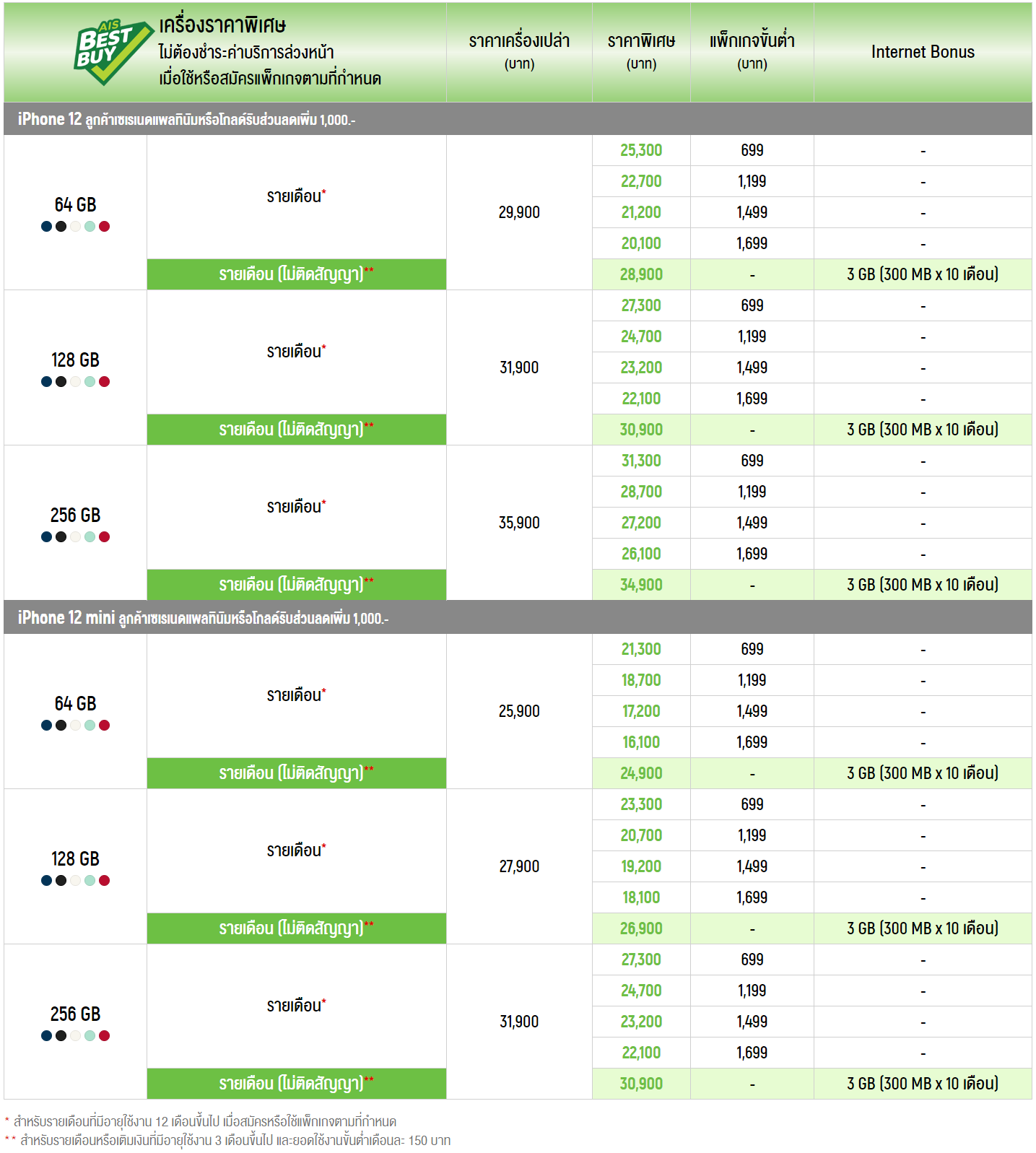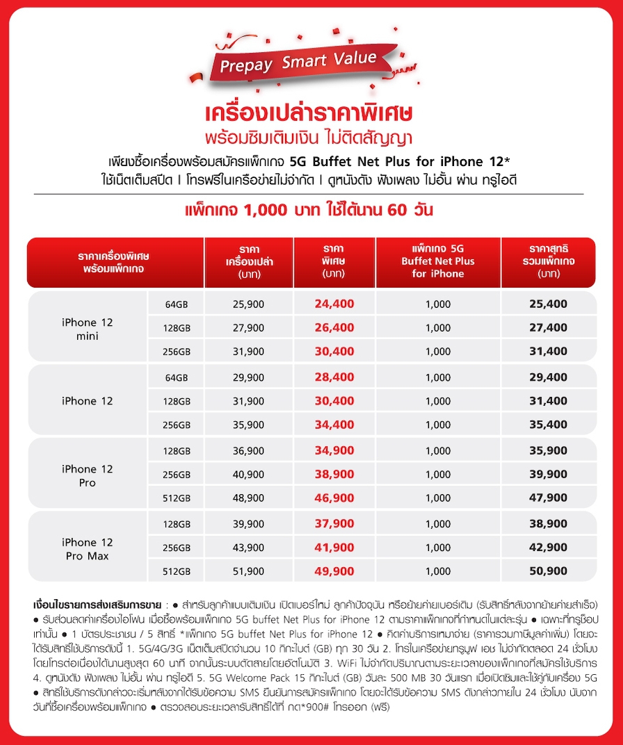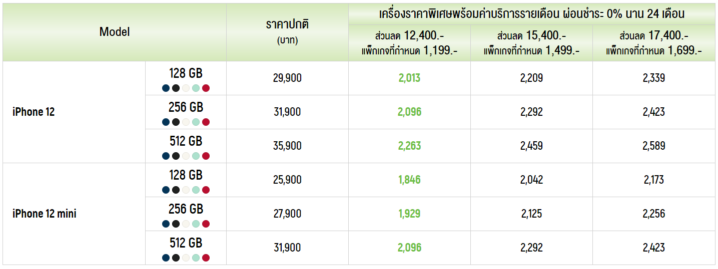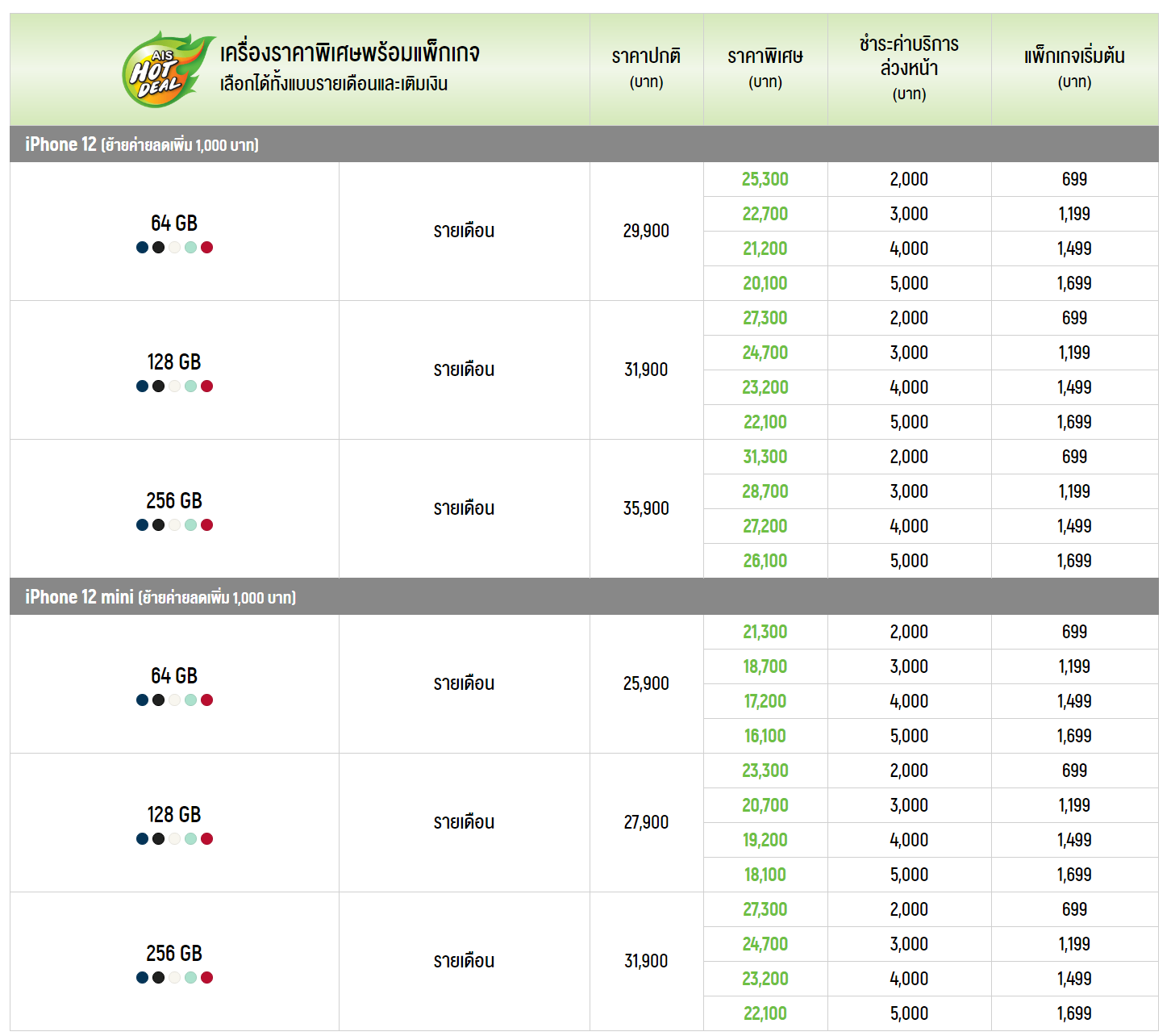 โปรโมชัน AIS Hot Deal เป็นเจ้าของ iPhone 12 และ iPhone 12 Mini ได้ในราคาเริ่มต้นเพียง 16,100 บาท สำหรับลูกค้าเปิดเบอร์ใหม่ ย้ายค่ายเบอร์เดิม เปลี่ยนจากเติมเงินเป็นรายเดือน และลูกค้าปัจจุบันในระบบรายเดือน เมื่อซื้อเครื่องพร้อมแพ็กเกจ AIS 5G One Plan for iPhone และลูกค้า AIS Serenade Gold และ Platinum รับส่วนลดเพิ่มอีก 1,000 บาท (ลูกค้าย้ายค่าเบอร์เดิมรับส่วนลดเพิ่ม 1,000 บาท)