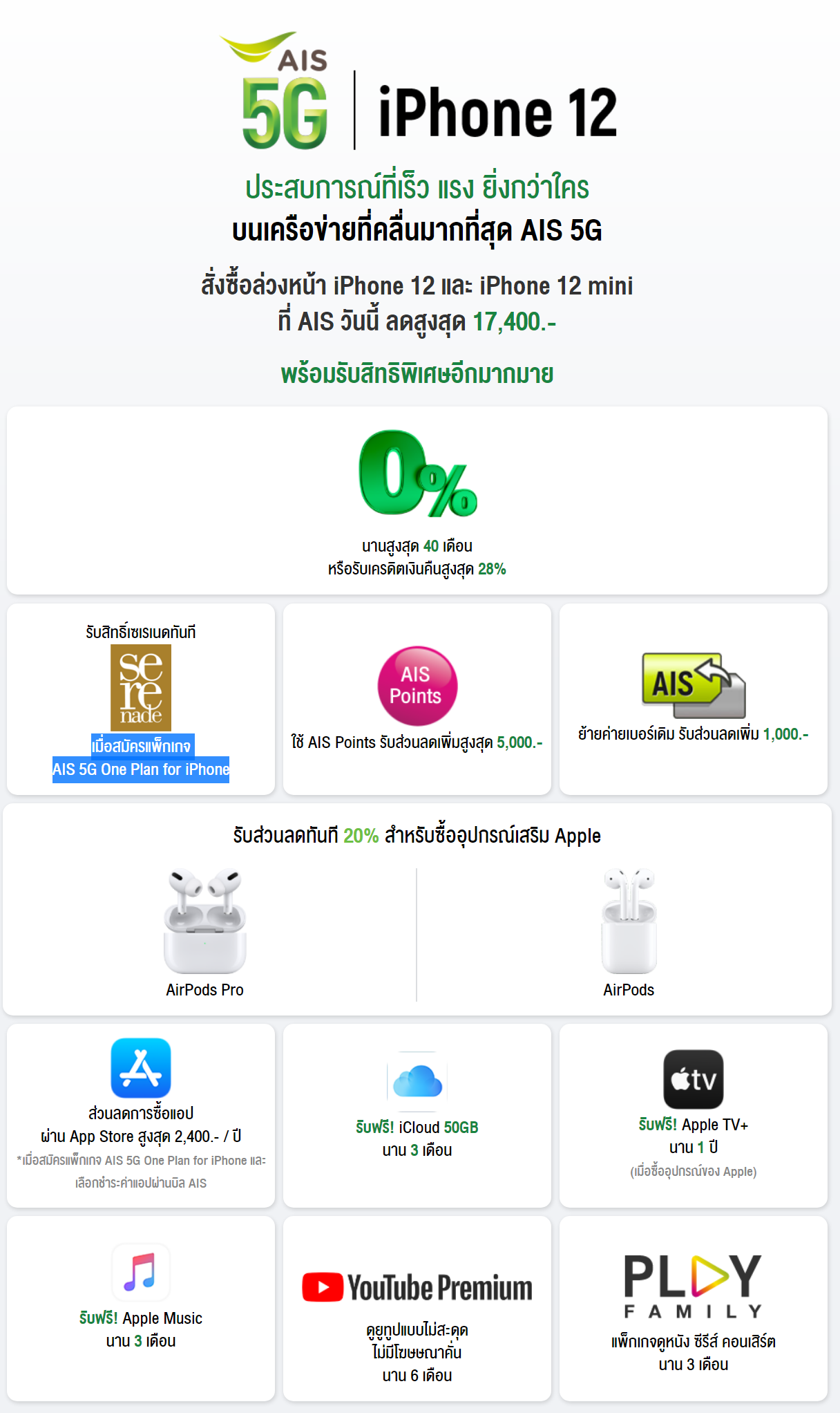 ประเดิมด้วยมือถือ 2 รุ่นเล็กของซีรีส์อย่าง iPhone 12 และ iPhone 12 Mini ที่ทาง AIS ประกาศว่าให้ส่วนลดสูงสุดถึง 17,400 บาทผ่อน 0% นานสูงสุด 24 เดือน ส่วนลูกค้าเปิดเบอร์ใหม่ ย้ายค่ายเบอร์เดิม เริ่มต้นเพียง 26,100 บาท และยังได้รับสิทธิพิเศษอื่นๆ อีกเพียบ เช่น สิทธิ์ AIS Serenade เมื่อสมัครแพ็กเกจ AIS 5G One Plan for iPhone, รับส่วนลดเพิ่มเมื่อใช้ AIS Point, รับส่วนลด 20% เมื่อซื้ออุปกรณ์เสริม Apple, รับฟรี Apple Music, iCloud, Apple TV+, YouTube Premium ฯลฯ