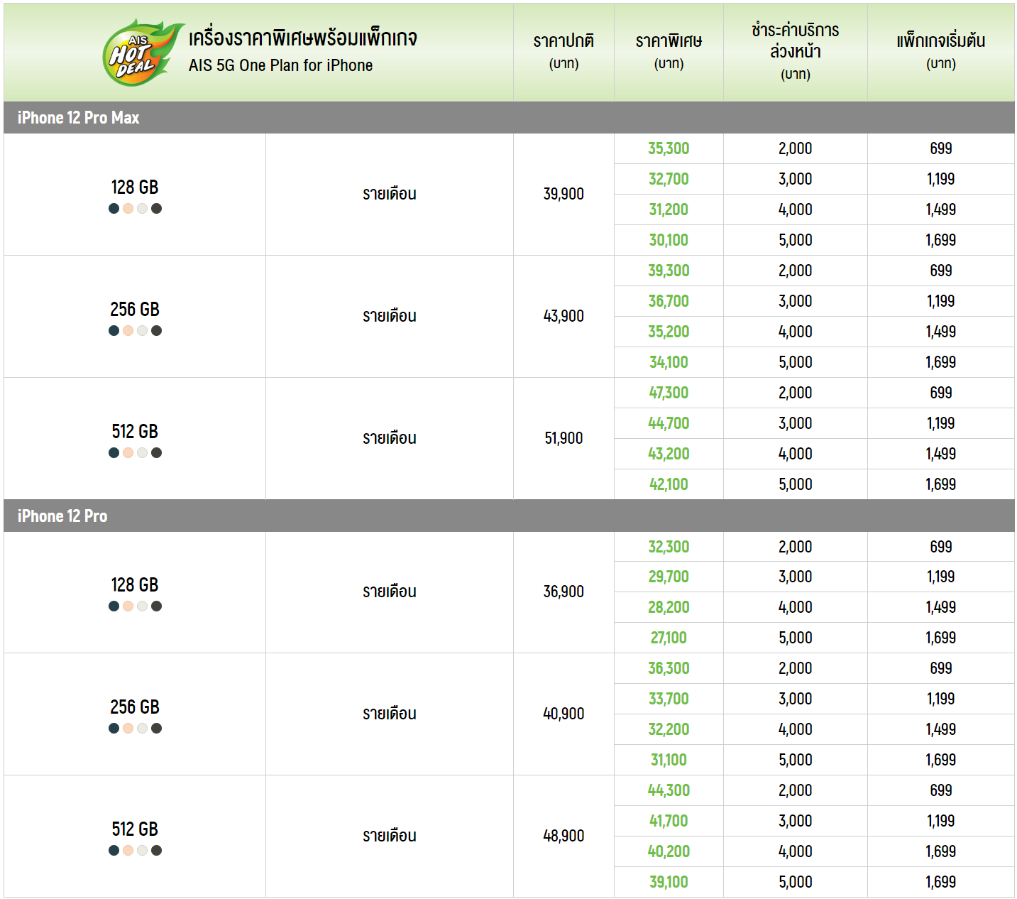 โปรโมชัน AIS Hot Deal ของ iPhone 12 Pro และ iPhone 12 Pro Max ได้ในราคาเริ่มต้นเพียง 27,100 บาท (iPhone 12 Pro 128GB) แพ็คเกจ AIS 5G One Plan for iPhone เริ่มต้นที่ 669 จนถึง 1,699 บาท