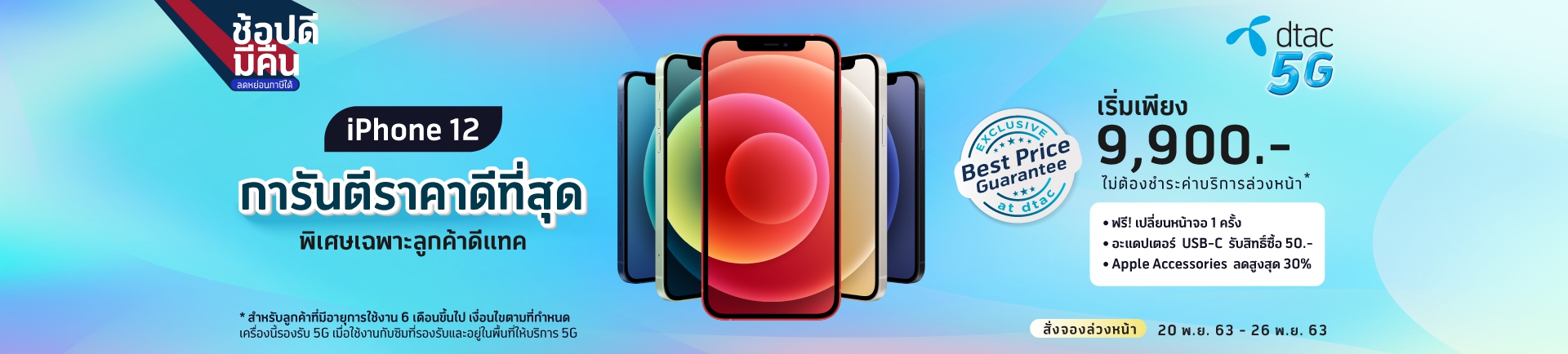 โปรโมชัน iPhone 12 ดีแทคก็ถือว่าน่าสนใจไม่น้อย ด้วย iPhone 12 และ iPhone 12 Mini เริ่มต้นเพียง 9,900 บาท iPhone 12 Max และ iPhone 12 Pro Max ลดสูงสุด 20,200 บาท พร้อมรับของแถมและสิทธิ์เปลี่ยนหน้าจอ 1 ครั้งฟรี