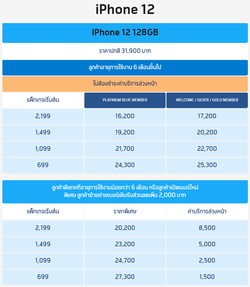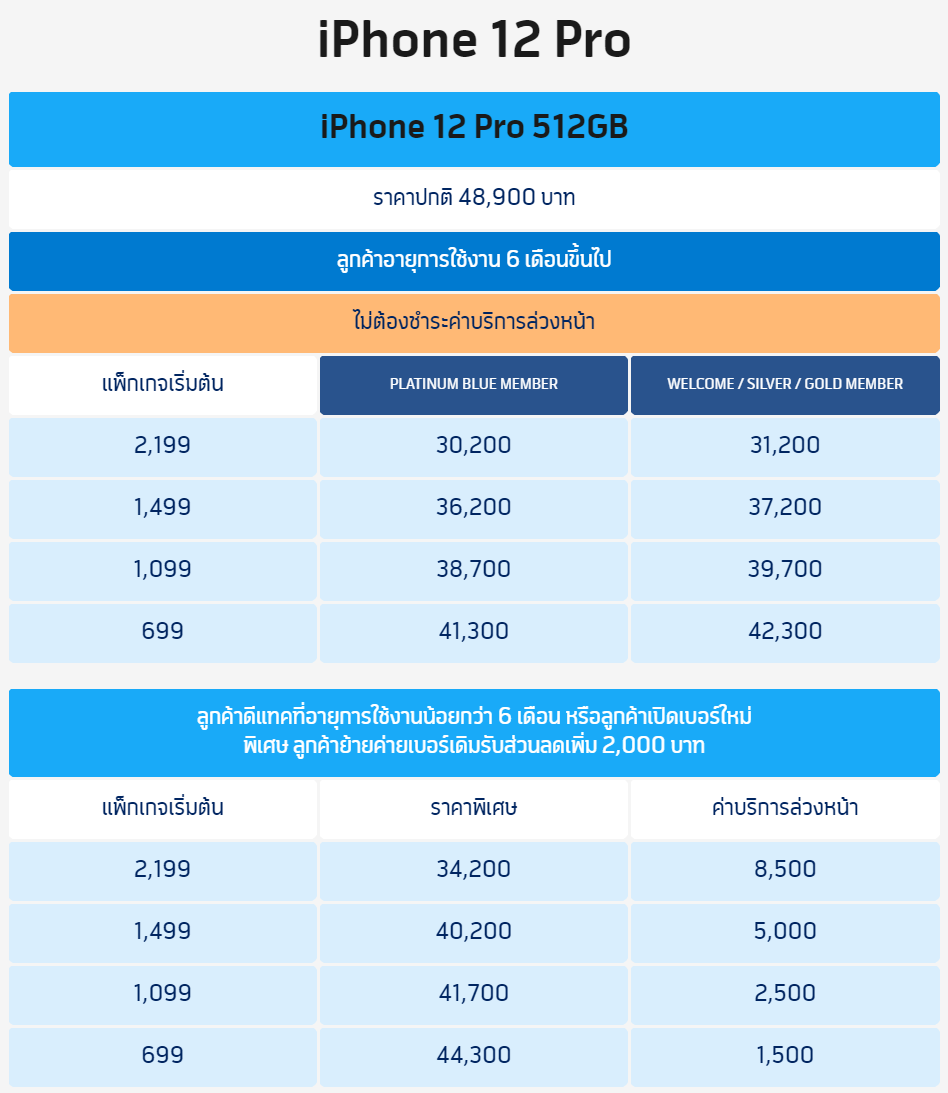 สำหรับโปรโมชัน iPhone 12 Pro Max จากดีแทคนั้น มีให้เลือกตั้งแต่ 128 GB 256 GB และ 512 GB เพียงเป็นลูกค้าดีแทคที่ใช้งาน 6 เดือนขึ้นไป ไม่ต้องชำระค่าบริการล่วงหน้า และยังมีราคาสำหรับลูกค้า Platinum Blue Member แต่ถ้าเป็นลูกค้าดีแทคที่ใช้งานน้อยกว่า 6 เดือน หรือลูกค้าเปิดเบอร์ใหม่ จะมีส่วนของค่าบริการล่วงหน้าที่ต้องชำระ พิเศษสุด! ลูกค้าย้ายค่ายเบอร์เดิมรับส่วนลด 2,000 บาท