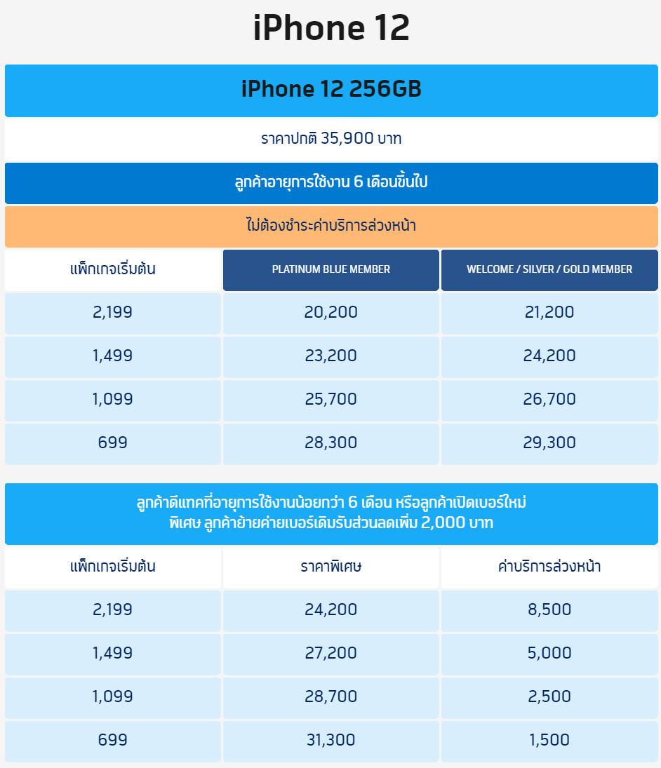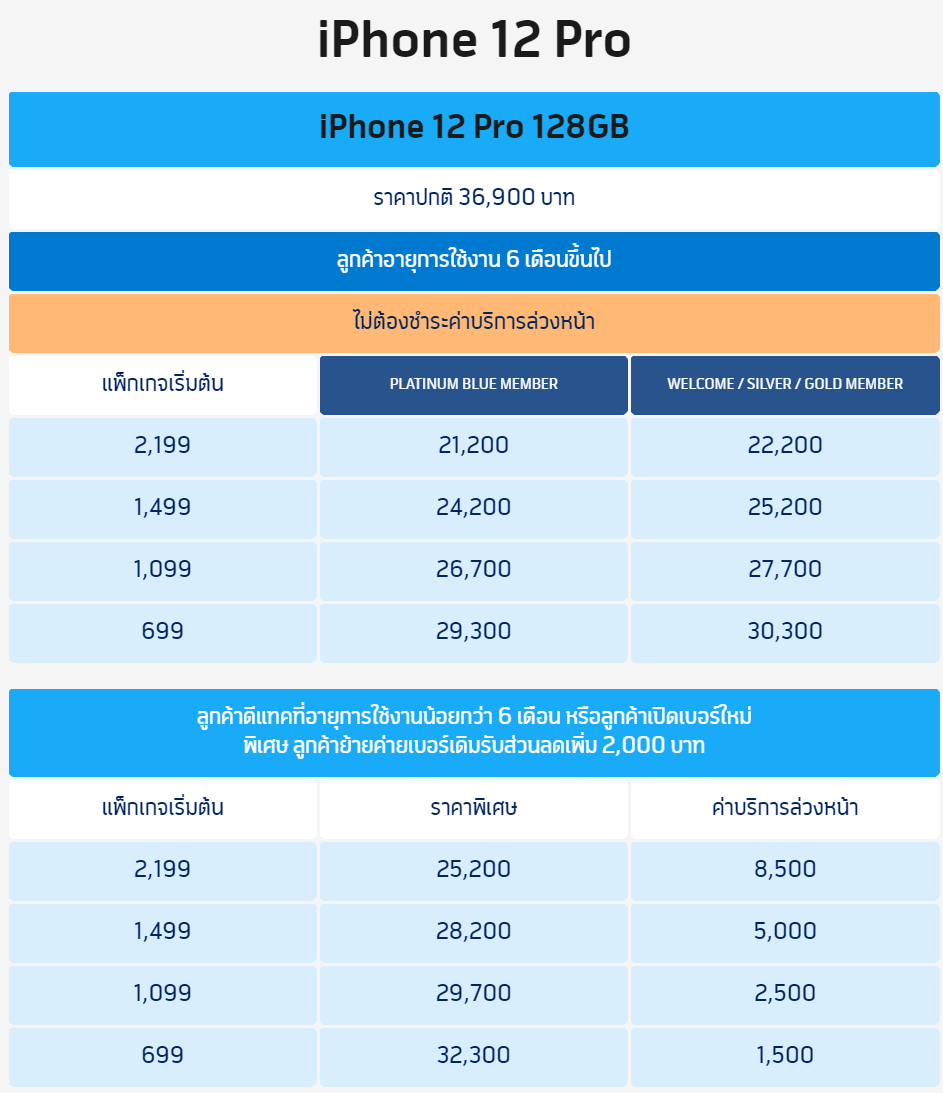 iPhone 12 Pro จากดีแทค ราคาเริ่มต้นที่ 21,200 บาท (เฉพาะ Platinum Blue Member) ไม่ต้องชำระค่าบริการล่วงหน้า ส่วนลูกค้าเปิดเบอร์ใหม่ เริ่มต้นที่ 25,200 บาท ลูกค้าย้ายค่ายเบอร์เดิมรับส่วนลด 2,000 บาท