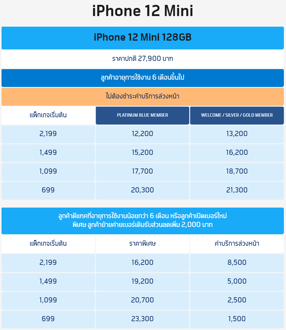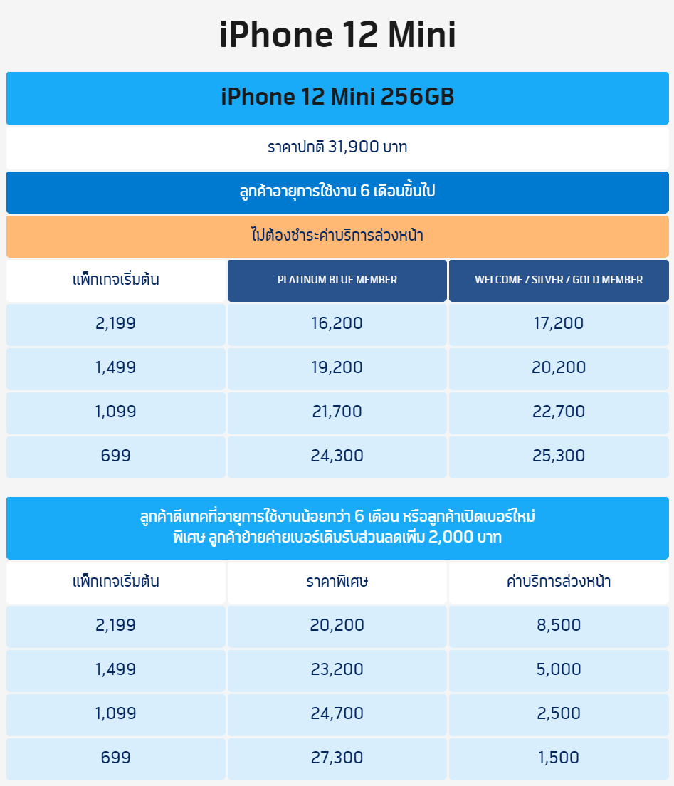 ปิดท้ายด้วยรุ่นน้องเล็กอย่าง iPhone 12 Mini จากดีแทค ด้วยราคาพร้อมแพ็คเกจที่ไม่ถึง 1 หมื่นบาท! เริ่มต้นเพียง 9,900 บาทเท่านั้น หรือจะเป็นลูกค้า Welcome, Silver และ Gold Member ก็ยังเริ่มต้นที่ 10,900 บาท