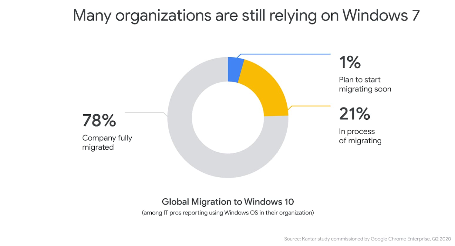 เราทราบมาว่ามีองค์กรบริษัทที่เป็นลูกค้าของเราราว 21% ที่ยังไม่ได้ปรับไปใช้งานระบบปฏิบัติการ Windows 10 กันทั้งหมด ดังนั้นการขยายการใช้งาน Chrome ออกไปก็น่าจะช่วยให้ผู้ใช้งานในส่วนนี้สามารถจัดสรรเวลาการปรับเปลี่ยนการใช้งานระบบปฏิบัติการใหม่ได้อย่างลงตัวมากขึ้น