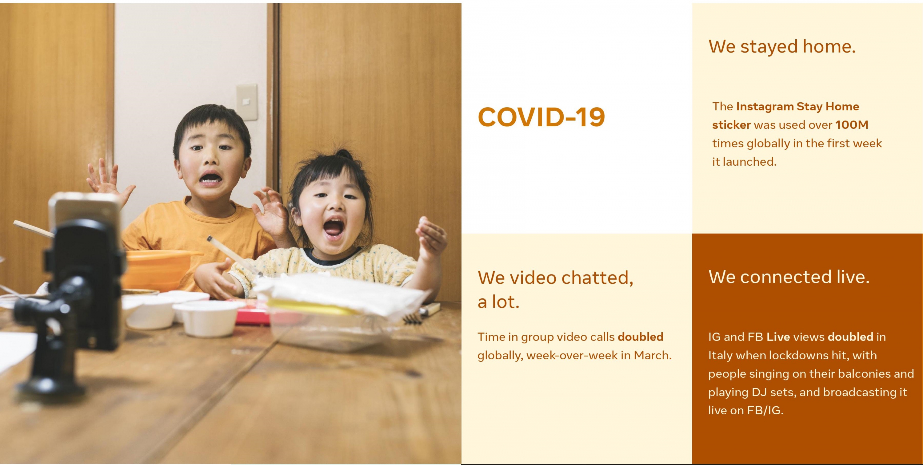 น่าจะเป็นเหตุการณ์ที่สร้างผลกระทบเป็นอันดับ 1 มีต่อผู้คนทั่วโลกเลยก็ว่าได้ สำหรับไวรัสโคโรนาหรือ COVID-19 โดยในเดือนมีนาคม ชาวสเปนกว่า 1.5 ล้านคนใช้แฮชแท็ก #aplausosanitario เพื่อแสดงความขอบคุณบุคลากรทางการแพทย์ ยอดรับชม Facebook Live และ Instagram Live ในอิตาลีเพิ่มขึ้นเป็น 2 เท่าในช่วงที่ต้อง Lockdown ในขณะเดียวกัน ผู้ชม Facebook Live ในสหรัฐอเมริกาเพิ่มขึ้น 50%