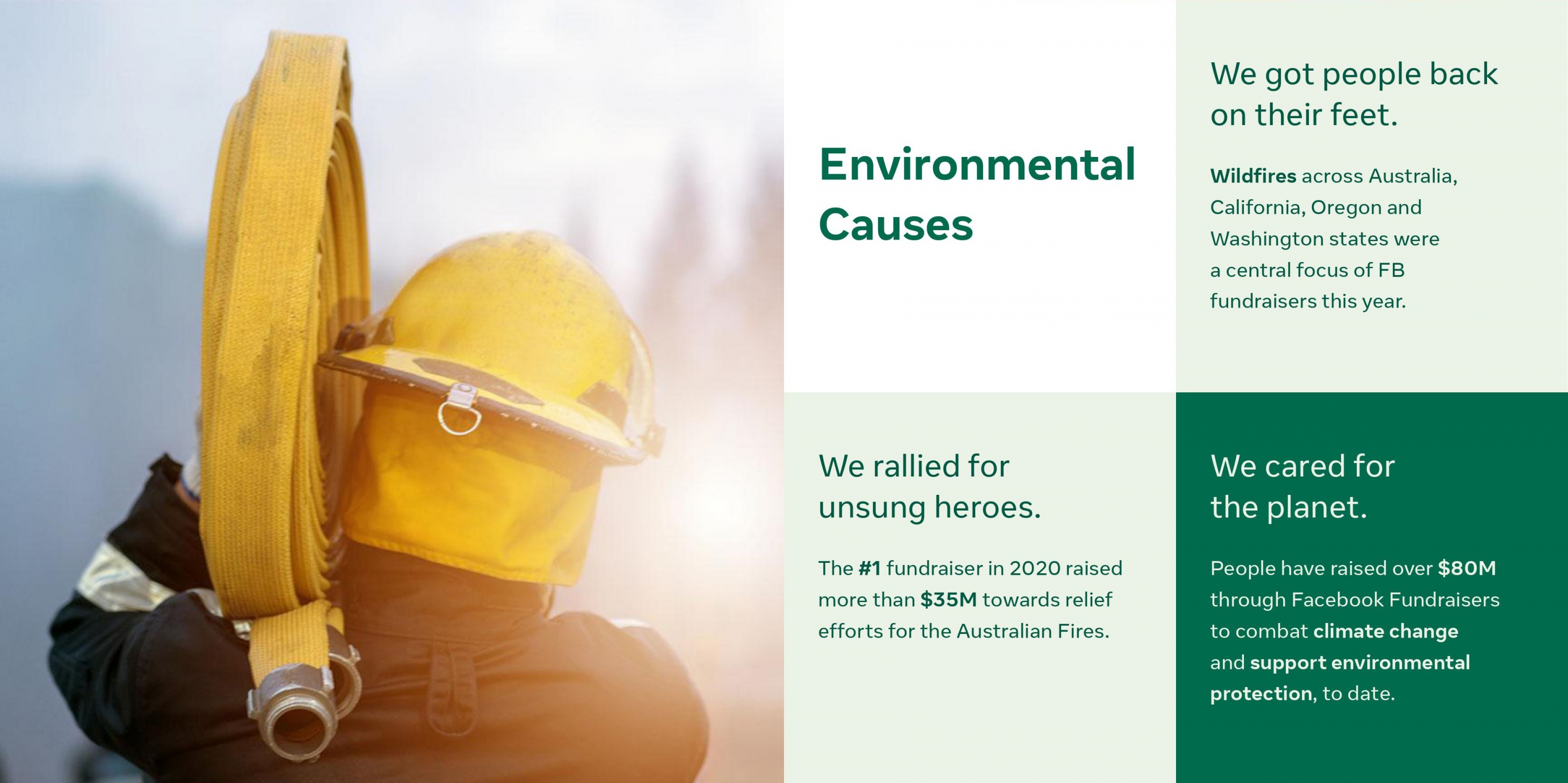 Facebook กลายเป็นสื่อสังคมออนไลน์ที่ผู้ใช้ส่วนใหญ่รวมถึง Facebook เอง สร้างแคมเปญเพื่อระดมทุน บริจาคเพื่อช่วยเหลือ เยียวยาเหตุการณ์ต่างๆ ซึ่งผู้คนมากกว่า 1.3 ล้านคนทั่วโลก มีสว่นร่วมในการระดมทุนของ Facebook ที่ใหญ่ที่สุดเท่าที่เคยมี Facebook ขึ้นมา ทั้งโครงการบรรเทาทุกข์ให้กับผู้ที่ได้รับผลกระทบจากไฟป่าในออสเตรเลียที่ระดมทุนได้มากกว่า 35 ดอลลาร์ จนถึงปัจจุบัน มีผู้ใช้ Facebook มากกว่า 2.6 ล้านคน บริจาคทุนถึง 87 ล้านดอลลาร์ ผ่านทาง Facebook Fundraisers เพื่อช่วยเหลือเหตุการณ์ภัยธรรมชาติและอื่นๆ