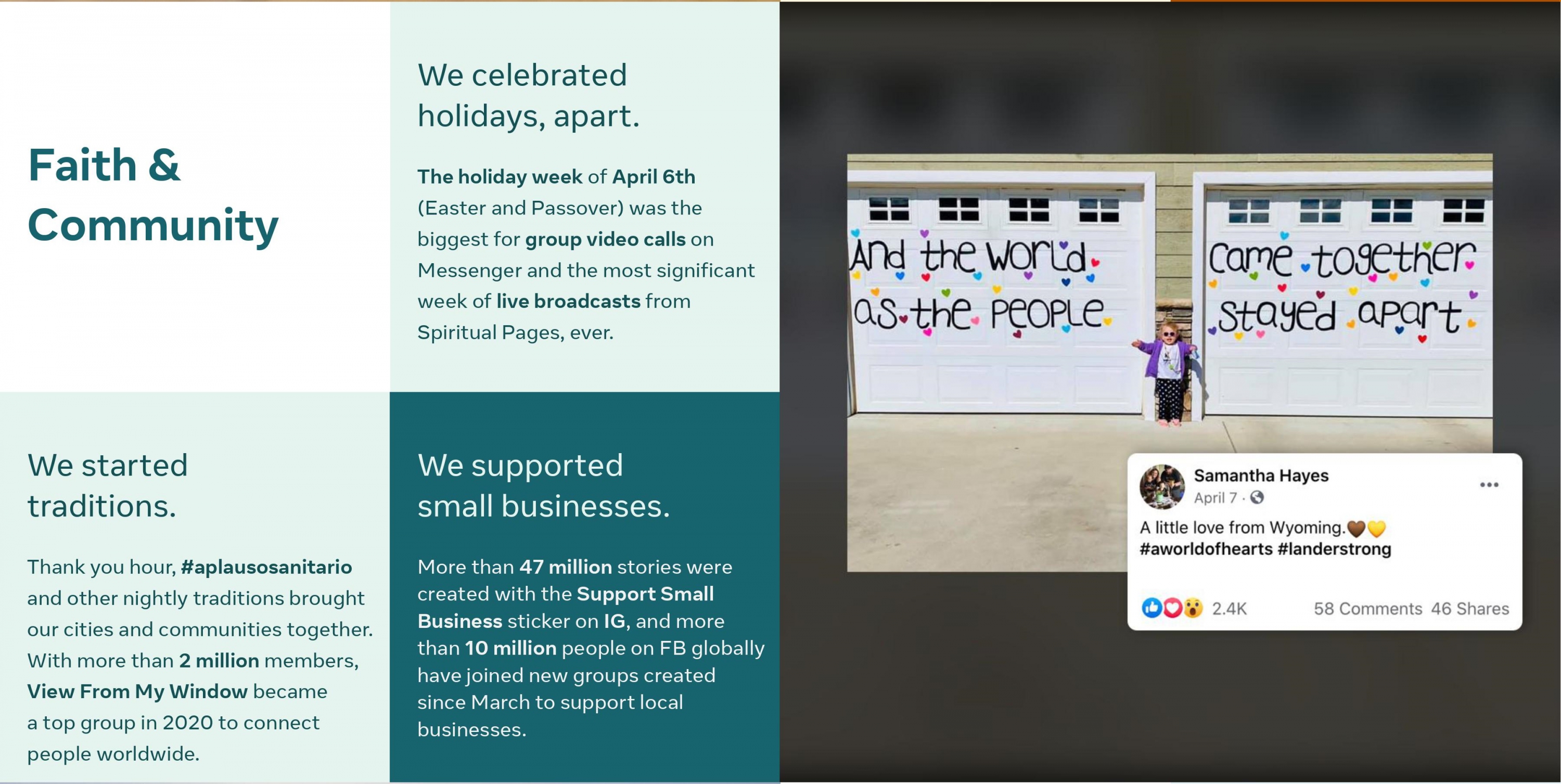 Facebook ไม่ได้มีประโยชน์แค่การติดต่อสื่อสารหรือโฆษณา ประชาสัมพันธ์ออนไลน์เท่านั้น แต่ยังสามารถเชื่อมความสัมพันธ์ของผู้คนในชุมชนเข้าหากัน อย่างเช่นการใช้สติกเกอร์ Support Small Business บน Instagram Stories ทั่วโลกในช่วง 3 เดือนที่ผ่านมา เพื่อประชาสัมพันธ์และสนับสนุนร้านค้า ธุรกิจขนาดเล็ก เพื่อการจับจ่ายใช้สอยที่สะดวกขึ้น รวมถึงการติดต่อสื่อสาร Video Call ผ่าน Messenger ในสัปดาห์เทศกาลอีสเตอร์ เนื่องจากผู้คนไม่สามารถรวมกลุ่มได้ในช่วงที่ COVID-19 ระบาดนั่นเอง