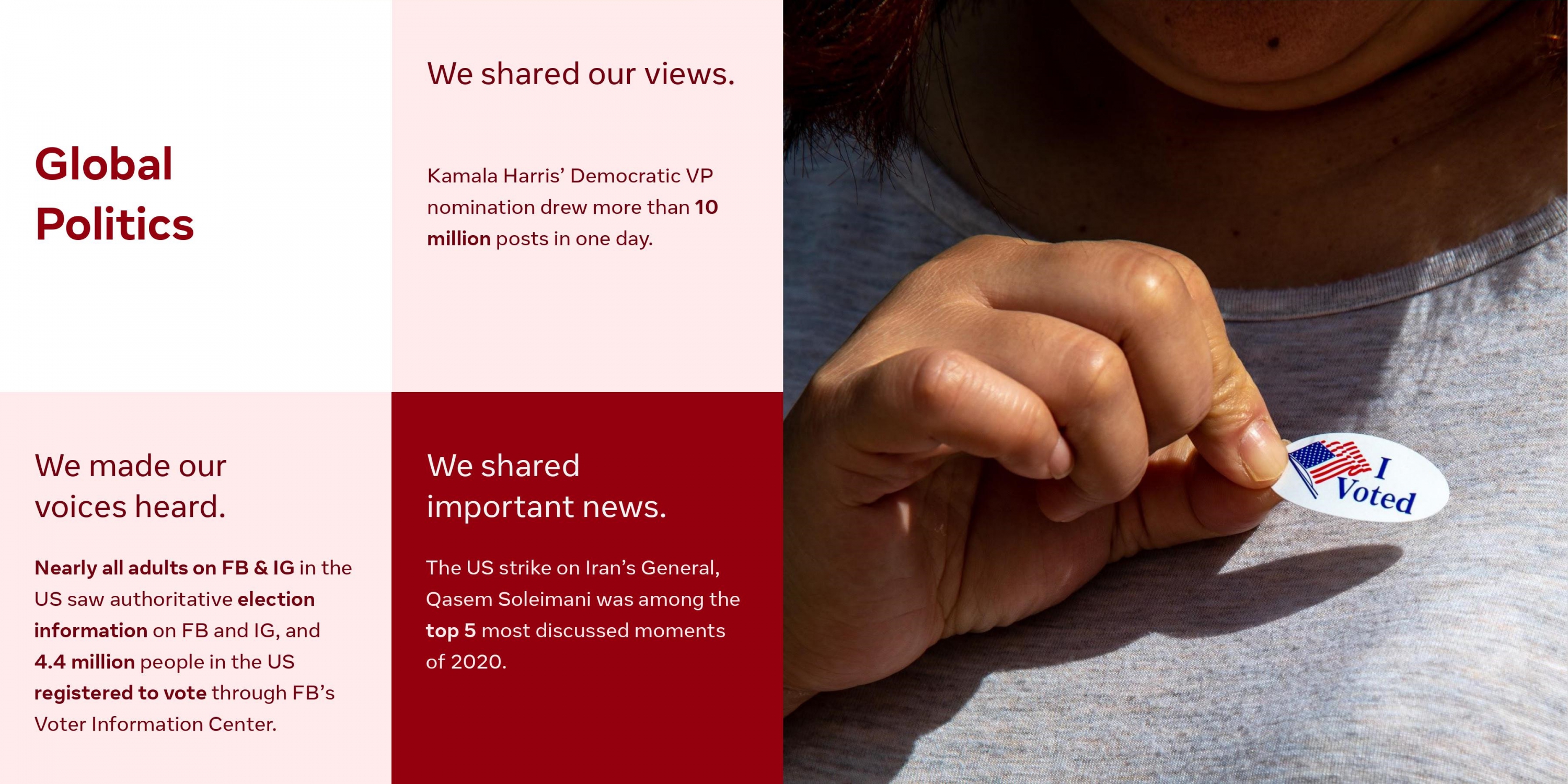 แม้หลายๆ ประเทศทั่วโลกจะมีสถานการณ์การเมืองที่ร้อนแรง แต่เหตุการณ์ที่ถือว่าเป็นอันดับ 1 แห่งปี 2020 ก็คือศึกเลือกตั้งประธานาธิบดีสหรัฐอเมริการะหว่างโดนัลด์ ทรัมป์กับโจ ไบเดน รวมถึงการคัดเลือกรองประธานาธิบดีกมลา แฮร์ริส ที่ถูกพูดถึงในเดือนสิงหาคมเป็นจำนวนกว่า 10 ล้านโพสต์ในวันเดียว นอกจากนี้ ผู้ใช้ Facebook และ Instagram ส่วนมากสามารถเข้าถึงศูนย์ข้อมูลการลงคะแนนเลือกตัง จึงทำให้สามารถติดตามการลงคะแนนเลือกตั้งได้อย่างรวดเร็ว