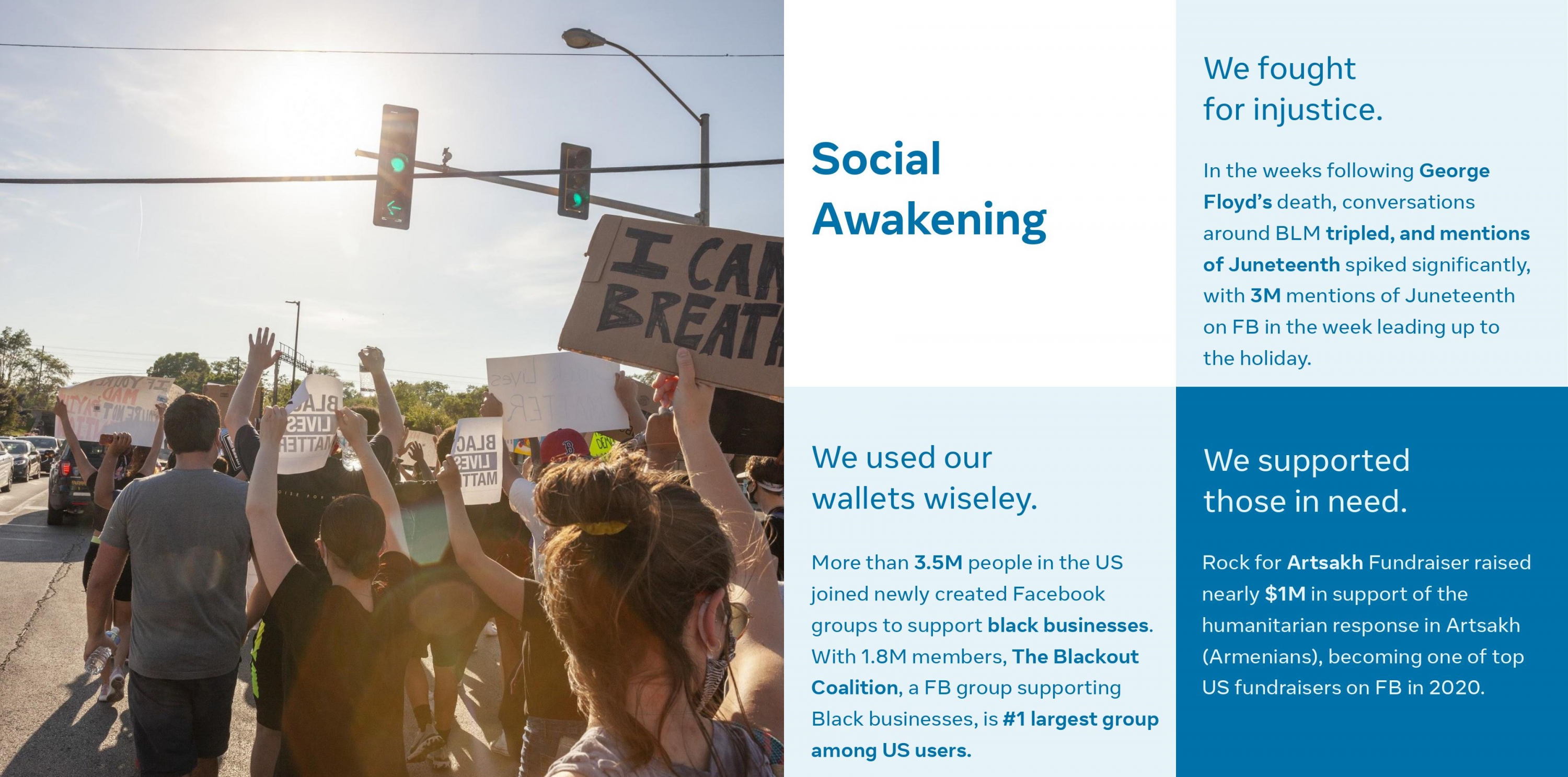 ในปี 2020 เป็นปีที่บุคคลมีชื่อเสียงระดับตำนานเสียชีวิต สร้างความโศกเศร้าไปทั่วโลก ทั้ง Kobe Bryant อดีตนักบาสเก็ตบอลชื่อดังที่เสียชีวิตจากอุบัติเหตุ โดยผู้ใช้ Facebook จากฝั่งสหรัฐอเมริกา เม็กซิโกและฟิลิปปินส์ได้แชร์โพลต์และรูปภาพมากที่สุดเพื่อแสดงความอาลัยต่อเหตุการณ์นี้ ส่วนผู้พิพากษาศาฎีกาอย่าง Ruth Bader Ginsburg ได้รับการยกย่องในการโพสต์มากกว่า 6 ล้านโพสต์ในหนึ่งวันบน Facebook และ Instagram ผ่านแฮชแท็ก #restinpower รวมถึงกระแส Black Lives Matter หลังจากการเสียชีวิตของ George Floyd ที่เพิ่มขึ้น 3 เท่า โดนประเด็นนี้มีการพูดถึงเฉลี่ยน 7.5 ล้านครั้งใน Facebook ทุกๆ วัน