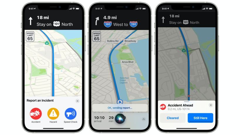 โดยผู้ใช้สามารถพูดว่า “Hey Siri, Report ...” (สวัสดี Siri, รายงาน (สิ่งที่พบเจอบนท้องถนน)) หรือแค่พูดว่า “มีกล้องจับความเร็วอยู่ข้างหน้า”, “ข้างหน้ามีอุบัติเหตุ” หรือ “เคลียร์อุบัติเหตุเรียบร้อยแล้ว” ก็สามารถเข้าใจได้และเพิ่มการรายงานไปบน Apple Maps ได้ในทันที