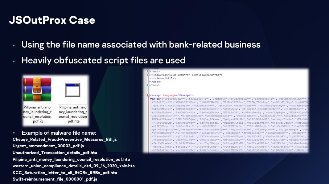 หนึ่งในแคมเปญที่เห็นคือมัลแวร์ “เจเอสเอ้าต์พร็อกซ์” (JsOutProx) แม้ว่าปัจจุบันมัลแวร์นี้จะไม่ใช่สายพันธุ์ที่มีความซับซ้อนสูง แต่ผู้เชี่ยวชาญของแคสเปอร์สกี้ตั้งข้อสังเกตว่า แคมเปญนี้ยังมีความพยายามอย่างต่อเนื่องในการแทรกซึมธนาคารในภูมิภาค