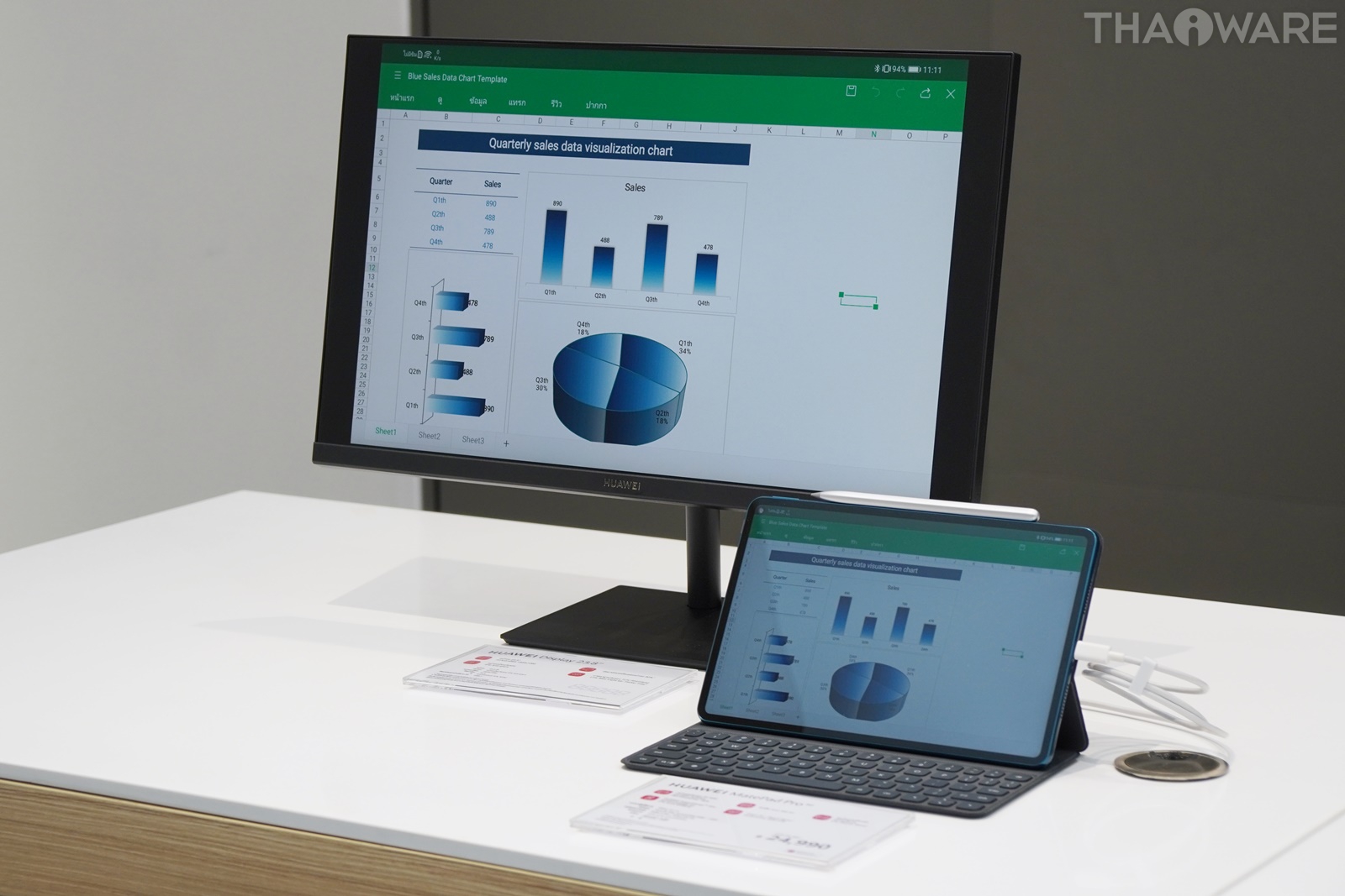 นอกจากนี้ ภายในงานยังมีอุปกรณ์เสริมให้ชมถึง 2 อย่าง ทั้ง M-Pencil ดินสอสำหรับเขียนหน้าจอแบบแม่เหล็ก และ HUAWEI Smart Keyboard เคสคีย์บอร์ดพกพา