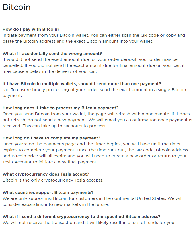 อย่างไรก็ตาม Elon Musk ก็ได้ระบุเพิ่มเติมว่าการชำระเงินผ่านด้วย Bitcoin นี้ยังรองรับการใช้จ่ายเฉพาะลูกค้าที่อยู่ใน สหรัฐอเมริกา เท่านั้น ส่วนประเทศอื่นยังไม่รองรับการจ่ายเงินในรูปแบบนี้ แต่ในอนาคตอาจเพิ่มการชำระเงินในช่องทางนี้แก่ลูกค้าในประเทศอื่น ๆ เพิ่มเติม แต่ในส่วนของ Cryptocurrencies สกุลอื่นนั้นยังไม่มีการพูดถึงว่าจะเพิ่มให้สามารถใช้จ่ายเพื่อซื้อ Tesla ได้แต่อย่างใด