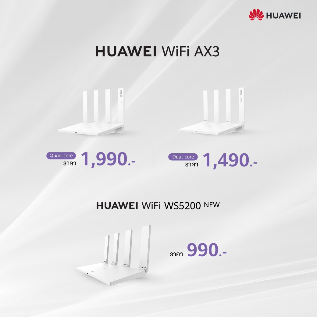 หัวเว่ยเปิดตัวเราเตอร์ 2 รุ่นใหม่ 3 รุ่นย่อย ได้แก่ HUAWEI WiFi AX3 ที่มีให้เลือกทั้งแบบ Quad-core และ Dual-core อีกรุ่นหนึ่งก็คือ HUAWEI WiFi W520 โดย HUAWEI WiFi AX3 รองรับอินเทอร์เน็ตความเร็วสูงสุด 3000 Mbps รองรับ WiFi 6 Plus เป็นที่เรียบร้อย พร้อมเทคโนโลยี Dynamic Narrow Bandwidth จาก Chipset Synergy เพื่อส่งสัญญาณผ่านสิ่งกีดขวาง เช่น กำแพง ผนัง ได้อย่างรวดเร็ว