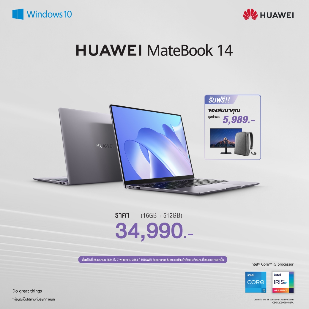 เมื่อ Pre-Order HUAWEI MateBook 14 ตั้งแต่วันนี้จนถึงวันที่ 7 พฤษภาคม 2564 รับของสมนาคุณฟรี จอมอนิเตอร์ HUAWEI Display 23.8” และกระเป๋า HUAWEI Backpack