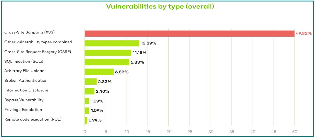 นอกจากนี้ Patchstack ยังชี้อีกว่า Cross-Site Scripting (XSS) เป็นจุดที่ได้รับแจ้งรายงานข้อบกพร่องของระบบเข้ามามากที่สุดถึง 49.82% ถัดมาเป็นแบบ “ผสม (Mixed)” ที่ 13.29% และตามมาด้วยรูปแบบอื่น ๆ อีกเล็กน้อย