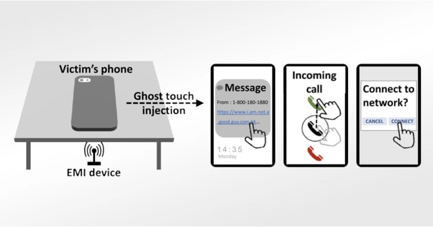 Talilเมื่อไม่กี่วันที่ผ่านมามีนักวิจัยกลุ่มหนึ่ง จากสถาบัน Zhejiang University และ Technical University of Darmstadt ได้มีการเผยแพร่เอกสารวิจัย ที่มีการค้นพบ วิธีโจมตี "แบบไร้สัมผัส" บนหน้าจอสมาร์ทโฟน โดยการสร้างสัญญาณรบกวนทางแม่เหล็กไฟฟ้า (EMI) เสมือนทำให้หน้าจอมีการถูกสัมผัส โดยพวกเขาได้เรียกการโจมตีนี้ว่า "GhostTouchAttack" (ตั้งชื่อตามปัญหาหน้าจอที่พบได้บ่อยในผู้ใช้สมาร์ทโฟน หรือปัญหา GhostTouch นั่นเอง)