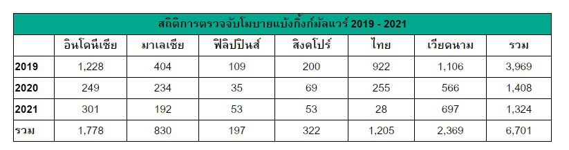 ตารางสถิติการตรวจจับมัลแวร์ Banking Trojan ทั้งหมดในอาเซียนปี ค.ศ. 2019 - 2021 จาก Kaspersky
