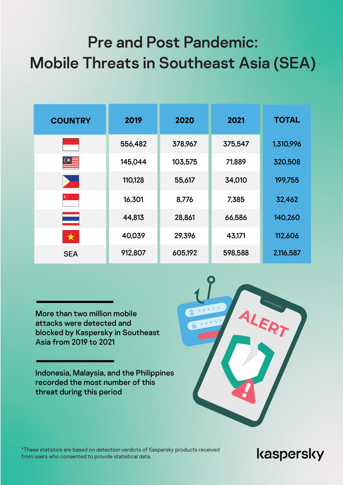 อินโฟกราฟิกสถิติการตรวจจับโมบายมัลแวร์ทั้งหมดในอาเซียนปี ค.ศ. 2019 - 2021 จาก Kaspersky