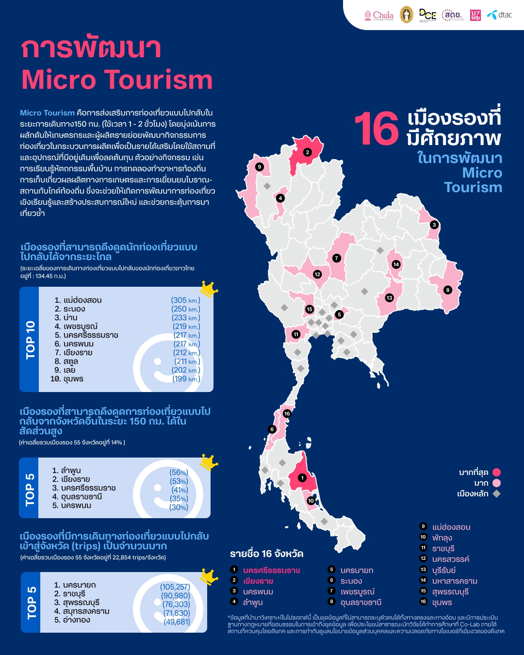 โดยจังหวัดเมืองรองที่มีศักยภาพในการพัฒนาการท่องเที่ยวแบบ Micro tourism อย่างโดดเด่นมีจำนวน 16 จังหวัดประกอบด้วยจังหวัดนครศรีธรรมราช เชียงราย นครพนม ลำพูน นครนายก ระนอง เพชรบูรณ์ อุบลราชธานี แม่ฮ่องสอน พัทลุง ราชบุรี นครสวรรค์ บุรีรัมย์ มหาสารคราม สุพรรณบุรี และชุมพรตามลำดับ