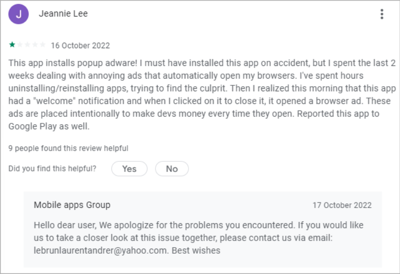ที่พอจะช่วยสแกนแอปฯ นี้ได้ ก็คือรีวิวจากผู้ใช้ใน Google Play ที่มีหลาย ๆ คอมเมนต์บอกว่าแอปฯ แอบเปิดเว็บโฆษณาเองบนแท็บเบราว์เซอร์ แต่ที่น่าสนใจกว่านั้นก็คือทางผู้พัฒนาฯ ตอบคอมเมนต์ว่าจะให้ความช่วยเหลือผู้ใช้งานอีกด้วย