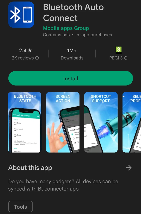 ดูจากชื่อแอปฯ ก็น่าโดนหลอกง่ายอยู่ อย่าง Bluetooth Auto Connect ก็คงเป็นฟังก์ชันที่หลาย ๆ คนต้องการ เอาเป็นว่าจำชื่อแอปฯ กับชื่อผู้พัฒนาเอาไว้ดี ๆ นะ