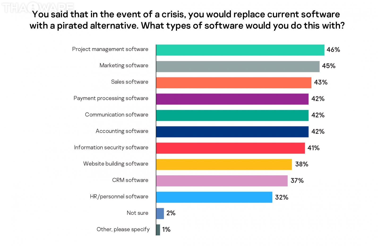 สำหรับประเภทของโปรแกรมที่ผู้ตอบแบบสอบถามเชื่อว่าสามารถแทนที่ด้วยเวอร์ชันที่ถูกแฮคได้ ส่วนใหญ่เลือกซอฟต์แวร์การจัดการโครงการ ซอฟต์แวร์การตลาดและการขาย พบว่าผู้ตอบแบบสอบถาม 41% ตกลงที่จะใช้ซอฟต์แวร์ความปลอดภัยทางไซเบอร์ที่ละเมิดลิขสิทธิ์