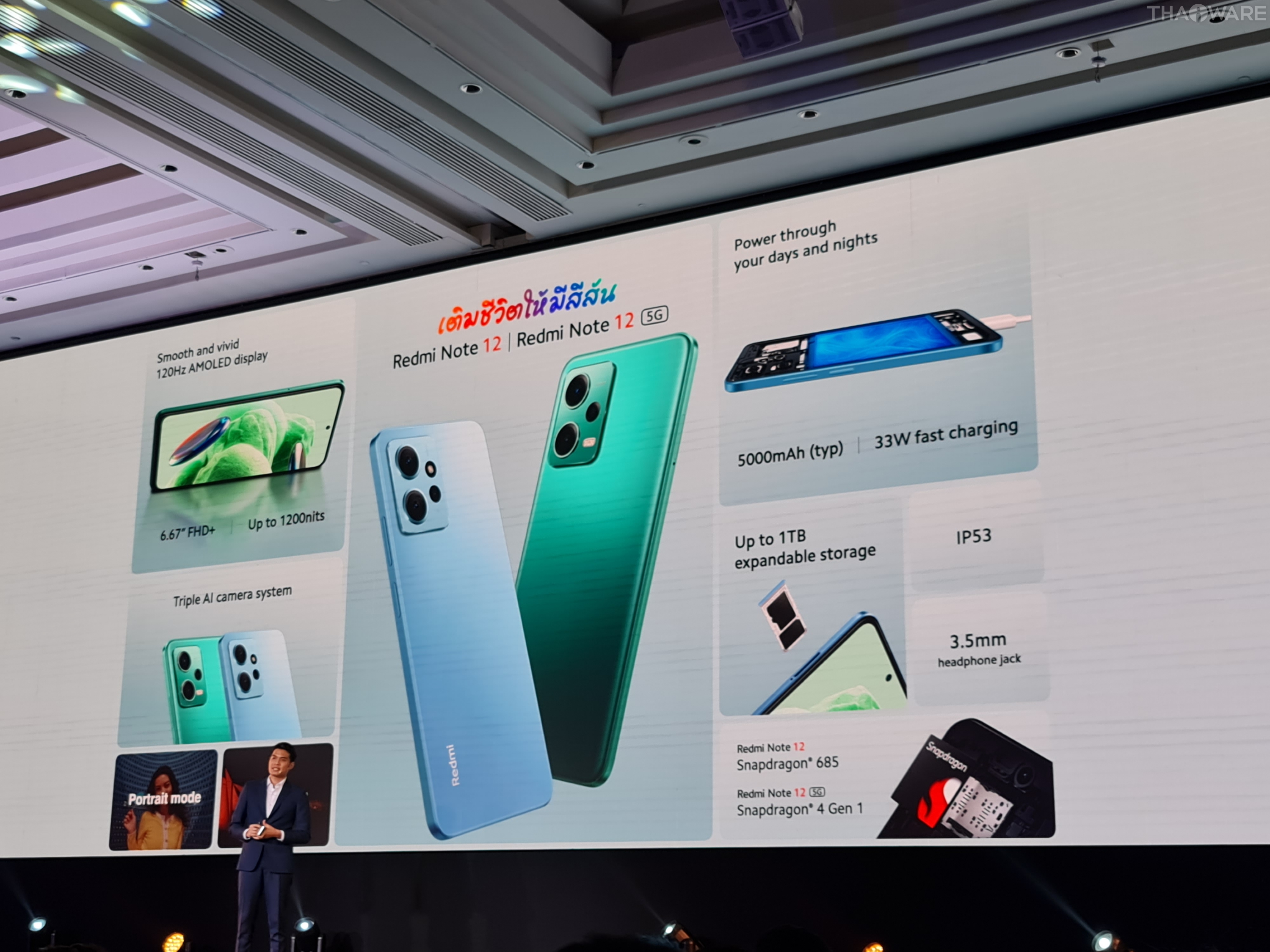 | Redmi Note 12 | 6GB+128GB | 6,699 บาท | Xiaomi Store และร้านตัวแทนจำหน่ายที่ร่วมรายการทั่วประเทศ รวมถึงช่องทางการจัดจำหน่ายออนไลน์แพลตฟอร์ม | 22 เมษายน 2566 | “Early Bird Promotion” สำหรับผู้ที่ซื้อ Redmi Note 12 5G หรือ Redmi Note 12 ในระหว่างวันที่ 22 เมษายน 2566 - 31 พฤษภาคม 2566 - ลูกค้าที่ซื้อ Redmi Note 12 5G รับฟรี กระเป๋า Duffle Bag มูลค่า 1,490 บาท - ลูกค้าที่ซื้อ Redmi Note 12 รับฟรี ลำโพง Soundbar Speaker มูลค่า 990 บาท (ของสมนาคุณมีจำนวนจำกัด และเงื่อนไขเป็นไปตามที่บริษัทฯกำหนด) |