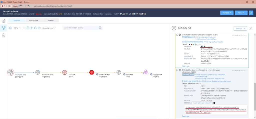 สำหรับการทำงานของมัลแวร์ในรูปแบบหลังนั้นจะมาจากตัวไฟล์โดยตรง ตัวระบบ Endpoint Detection and Response (EDR) ซึ่งเป็นโซลูชันด้านการตรวจจับ และป้องกันภัยคุกคามทางไซเบอร์ ได้ตรวจพบถึงขั้นตอนการทำงานที่นำไปสู่การนำเข้าไฟล์มัลแวร์ดังกล่าว ซึ่งโดยย่อนั้น หลังจากที่เหยื่อทำการเปิดไฟล์ .docx ที่มีมัลแวร์ฝังอยู่ ตัวสคริปบนไฟล์จะนำไปสู่การสั่งการให้ Outlook (outlook.exe) ทำการรัน Microsoft Word (winword.exe), Command prompt (cmd.exe) และ PowerShell (powershell.exe) ขึ้นมาพร้อมกับไฟล์สำหรับการรันมัลแวร์ iu4t4.exe ผ่านการใช้เครื่องมืออย่าง rundll32.exe