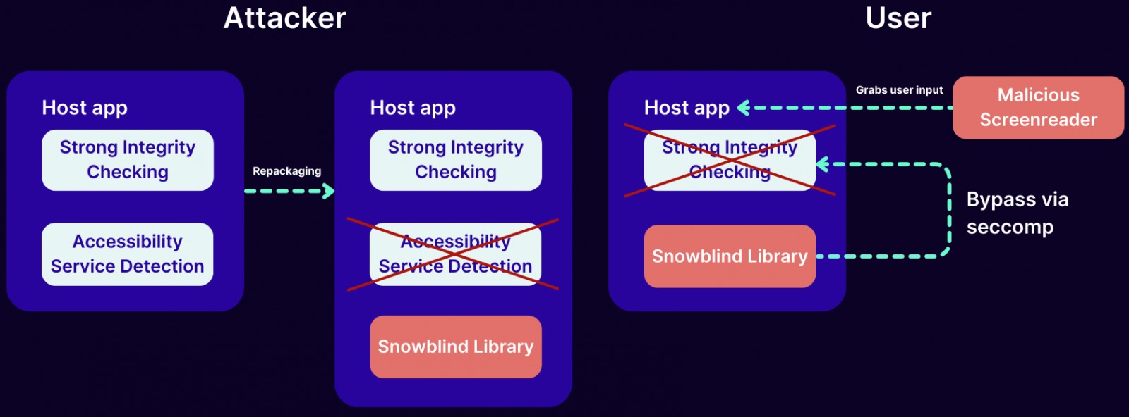 สำหรับการโจมตีเพื่อฝ่าระบบป้องกันของมัลแวร์ตัวดังกล่าวนั้น ตัวแอปพลิเคชันแฝงมัลแวร์ดังกล่าวจะทำการยิง Native Library ของตัว Snowblind ที่ทำการโหลดก่อนที่จะตัวระบบมีการรันโค้ด Anti-Tampering (ระบบป้องกันการติดตั้งแอปพลิเคชันที่มีการทำ Repackaging ขึ้นมา) หลังจากนั้นตัวไฟล์ก็จะทำการติดตั้งตัว Seccomp Filter เพื่อทำการหลอกฟีเจอร์ Seccomp ให้เปลี่ยนเป้าหมายการตรวจจับจากทั้งแพ็กเกจ ไปที่ตัวแอปปกติที่อยู่ในแพ็กเกจติดตั้ง ซึ่งเป็นการหลอกลวงว่าไฟล์ติดตั้ง (.APK) ดังกล่าวนั้นไม่ได้ถูก Repackage มาแต่อย่างใด ทำให้เกิดการรันทั้งในส่วนแอป และมัลแวร์ขึ้นมาพร้อมกันโดยที่เครื่องไม่มีอาการหน่วง และเหยื่อไม่มีทางรู้ตัวว่าได้ติดตั้งไฟล์ที่มีมัลแวร์ลงเครื่องไปแล้ว