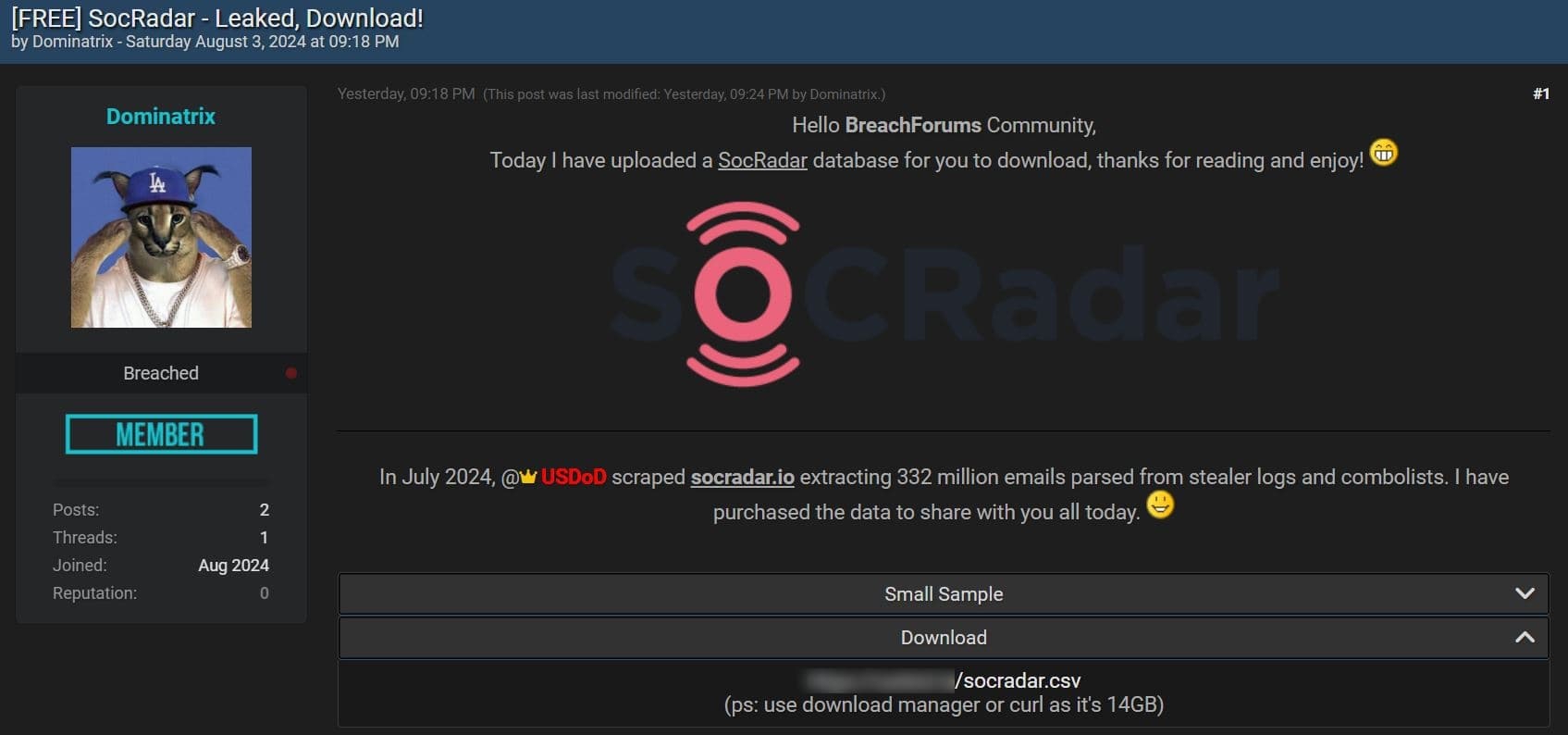 จากรายงานโดยเว็บไซต์ Hackread ได้รายงานว่ากลุ่มแฮกเกอร์ USDoD ได้ทำการดูดที่อยู่อีเมลจากเว็บไซต์ SOCRadar.io ซึ่งเป็นเว็บไซต์ของบริษัทที่พัฒนาเครื่องมือด้านความปลอดภัยไซเบอร์ โดยข้อมูลที่ได้มาจะมีแค่เพียงที่อยู่อีเมลเท่านั้น ไม่ได้มีการหลุดของข้อมูลอื่น ๆ เช่น รหัสผ่าน, ชื่อ, ที่อยู่ และ ข้อมูลอ่อนไหวต่าง ๆ ทำให้เหตุการณ์นี้ไม่นับเป็นการรั่วไหลของข้อมูล (Breach of Data) โดยข้อมูลอีเมลที่ทาง USDoD นั้นได้มาทั้งหมดตีเป็นความจุประมาณ 14 GB มาในรูปแบบไฟล์สเปรดชีทแบบ CSV ซึ่งแฮกเกอร์กลุ่มดังกล่าวได้ทำการประกาศขายข้อมูลในราคาถึง 7,000 ดอลลาร์สหรัฐ (ประมาณ 240,000 บาท) ในวันที่ 24 กรกฎาคม ที่ผ่านมา
