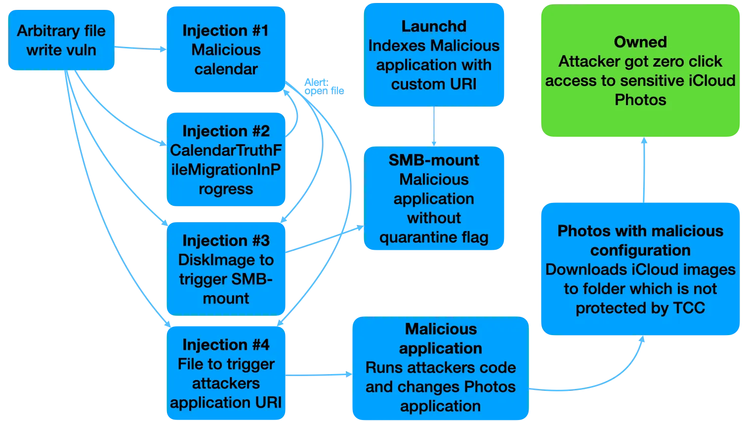 อันจะนำไปสู่การเปิดทางให้แฮกเกอร์สามารถทำการยิงโค้ดจากระยะไกล (RCE หรือ Remote Code Execution) ได้ในท้ายที่สุด ซึ่งทางนักวิจัยได้ทำการสาธิตการใช้งานช่องโหว่ดังกล่าว โดยปรากฎว่าสามารถทำการหลบเลี่ยง (Bypass) ผ่านระบบยืนยันตัวตนเพื่อรักษาความปลอดภัยของ macOS ชื่อว่า Transparency, Consent, and Control (TCC) ได้ นำไปสู่การลักลอบขโมยรูปที่ฝากไว้บน iCloud ได้ในท้ายที่สุด