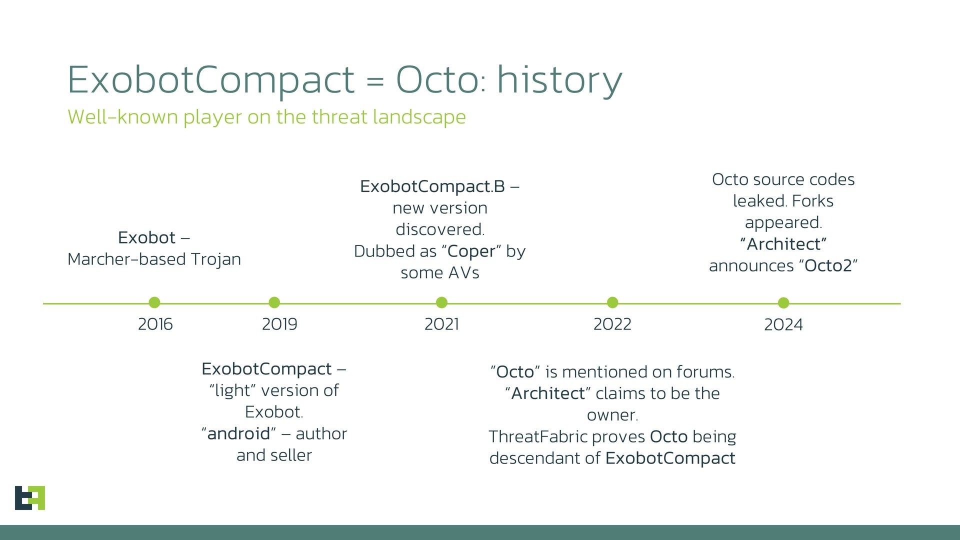 จากรายงานข่าวโดยเว็บไซต์ Britain’s News Channel ได้รายงานถึงการตรวจพบมัลแวร์ตัวใหม่โดยทางทีมวิจัยแห่ง ThreatFabric ซึ่งเป็นผู้เชี่ยวชาญด้านการจัดการภัยออนไลน์จากประเทศเนเธอร์แลนด์ โดยทางทีมวิจัยได้รายงานถึงการตรวจพบมัลแวร์ Octo2 ซึ่งเป็นมัลแวร์ประเภท Exobot ที่มีความสามารถในการเข้าควบคุมการโทรเข้าออก, เข้าถึงข้อความสั้น SMS (Short Message Services), และบงการการแจ้งเตือนบนหน้าจอ หรือ Push Notification