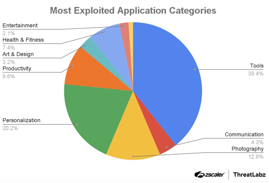 โดย 5 อันดับของหมวดหมู่แอปพลิเคชันที่มัลแวร์แฝงตัวนั้นคือ หมวดเครื่องมือ (Tools) มากถึง 39.4% ตามมาด้วย แอปพลิเคชันเพื่อการปรับแต่งเครื่องด้วยจุดประสงค์ในการแสดงตัวตน (Personalization) ที่ 20.2%, แอปพลิเคชันเกี่ยวกับรูปภาพ ที่ 12.8%, แอปพลิเคชันด้านการผลิต (Productivity) ที่ 9.6%, และ หมวดสุขภาพ (Health & Fitness) ที่ 7.4% ซึ่งถึงแม้จะมีแอปพลิเคชันอันตรายมากกว่า 200 ตัวดังที่กล่าวมาข้างต้น แต่ทาง Zscaler ก็ได้ประเมินว่า เมื่อเทียบกับจำนวนแอปพลิเคชันทั้งหมดบนแอปสโตร์แล้ว ก็จะมีอยู่เพียงแค่ 1% ไม่เกิน 2% เท่านั้น แต่ก็ยังกำชับให้ผู้อ่านทุกคนอยู่ในความไม่ประมาท