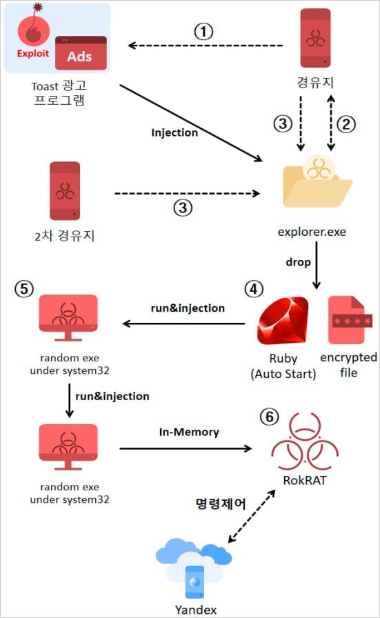ซึ่งการรันโค้ดจากระยะไกลดังกล่าวนั้น จะเปิดโอกาสให้แฮกเกอร์สามารถทำการปล่อยมัลแวร์ RokRAT ซึ่งเป็นมัลแวร์ประเภทควบคุมเครื่องจากระยะไกล (Remote Access Trojan หรือ RAT) โดยมัลแวร์ตัวนี้มีความสามารถในการส่งออกไฟล์ที่มีนามสกุลที่ถูกกำหนดไว้ประมาณ 20 สกุล (จากแหล่งข่าวนั้นไม่ได้กล่าวครบทุกสกุลไฟล์ แต่ได้มีการยกตัวอย่างบางสกุล เช่น .doc, .mdb, .xls, .ppt, .txt, และ .amr เป็นต้น) ส่งไปยังแหล่งเก็บไฟล์ที่แฮกเกอร์ตั้งค่าไว้บน Yandex Cloud ทุก ๆ 30 นาที รวมไปถึงมีความสามารถในการตรวจจับการพิมพ์บนคีย์บอร์ด (Keylogging), การตรวจจับข้อมูลที่ถูกคัดลอกไว้บน Clipboard, รวมไปถึงมีการบันทึกภาพหน้าจอทุก 3 นาที อีกด้วย นอกจากนั้นยังมีการฝังตัวของมัลแวร์ไว้บน Process ชื่อว่า 'explorer.exe' และ ซ่อนไฟล์สำหรับการรันมัลแวร์ไว้บนโฟลเดอร์ C:Windowssystem32 เพื่อหลบเลี่ยงการตรวจจับของระบบป้องกัน และแอนตี้ไวรัสต่าง ๆ ที่ร้ายไปกว่านั้นคือ มีการสร้างการทำงานแบบต่อเนื่องเพื่อรับประกันว่ามัลแวร์จะทำงานได้ตลอดเวลาทุกครั้งที่เปิดเครื่อง (Persistence) ด้วยการฝังไฟล์มัลแวร์ 'rubyw.exe' ไว้ในส่วนของ Startup และตั้งเวลาให้มีการรันใหม่ทุก 4 นาที เรียกได้ว่ามัลแวร์ตัวนี้มีความสามารถทั้งการขโมยข้อมูล, หลบเลี่ยงการตรวจจับ และแฝงตัวในระบบที่ร้ายกาจทีเดียว