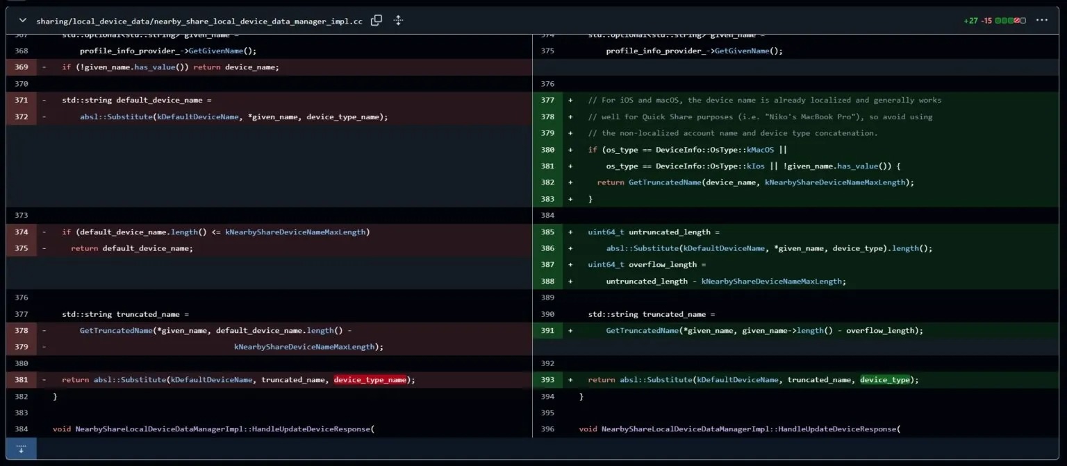 ทีมข่าวจากเว็บไซต์ Android Authority ได้มีการตรวจพบคอมเมนต์จากวิศวกรซอฟต์แวร์ที่ทำงานให้กับทาง Google ซึ่งคอมเมนต์ดังกล่าวนั้นเป็นการกล่าวถึงโค้ดที่จำเป็นสำหรับแอปพลิเคชัน QuckShare ซึ่งเป็นแอปพลิเคชันที่ใช้สำหรับการแชร์ไฟล์ระหว่างผู้ใช้งาน Android คล้ายคลึงกับ AirDrop ของผู้ใช้งาน iOS แต่ในคอมเมนต์ดังกล่าวนั้นกลับมีการกล่าวถึง iOS และ macOS ด้วย