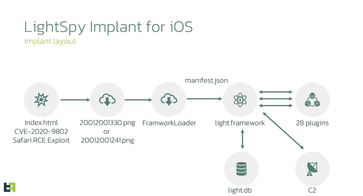 ซึ่งการโจมตีของมัลแวร์ตัวดังกล่าวจะเริ่มขึ้นด้วยการใช้ช่องโหว่ของเว็บเบราว์เซอร์ Safari ที่มีชื่อว่า CVE-2020-9802 โดยเป็นช่องโหว่ที่เปิดช่องให้แฮกเกอร์สามารถข้อบกพร่องในส่วนของ WebKit เพื่อเข้าสู่ระบบได้ ซึ่งในกรณีนี้จะเป็นการแฮกผ่านสคริปท์ในรูปแบบ HTML หรือ “HTML-based exploit delivery system” ซึ่งจะนำไปสู่การรัน “FrameworkLoader” เพื่อทำ JailBreak เครื่อง ซึ่งเป็นเทคนิคที่เรียกว่า “Rootless Jailbreak” โดยการทำ JailBreak ดังกล่าวนั้นจะเป็นการทำเพียงชั่วคราว และเครื่องจะกลับคืนสู่สภาวะปกติหลังการรีบูท (1-day Exploits) จากนั้นมัลแวร์ก็จะทำการฝังตัวแกนของที่มีชื่อว่า “LightSpy Core” พร้อมทั้ง Plugin ต่าง ๆ ที่เกี่ยวข้อง โดยตัวมัลแวร์ (Light.framework) จะทำการติดต่อกับฐานข้อมูลหลัก (Light.db) ซึ่งมีการบรรจุคำสั่งเพื่อสั่งการในการทำงานต่าง ๆ และเซิร์ฟเวอร์ควบคุม (C2 หรือ Command and Control) ซึ่งมีอยู่ 5 แห่ง ผ่านการติดต่อด้วยเครื่องมือที่มีชื่อว่า “WebSocket Connections” โดยทีมวิจัยได้ระบุว่า ตัวมัลแวร์จะทำการสื่อสารกับ C2 ผ่านหมายเลข IP “103.27.109[.]217” ที่มีการใช้ใบรับรองที่ทางแฮกเกอร์สร้างขึ้นเอง (Self-Signed SSL Certificates) ไม่เพียงเท่านั้น ยังมีรายงานอีกว่ามัลแวร์เวอร์ชันล่าสุดนี้มีการใช้ช่องโหว่ CVE-2020-3837 เพื่ออัปเกรดสิทธิ์ในการเข้าถึงและควบคุมระบบอีกด้วย
