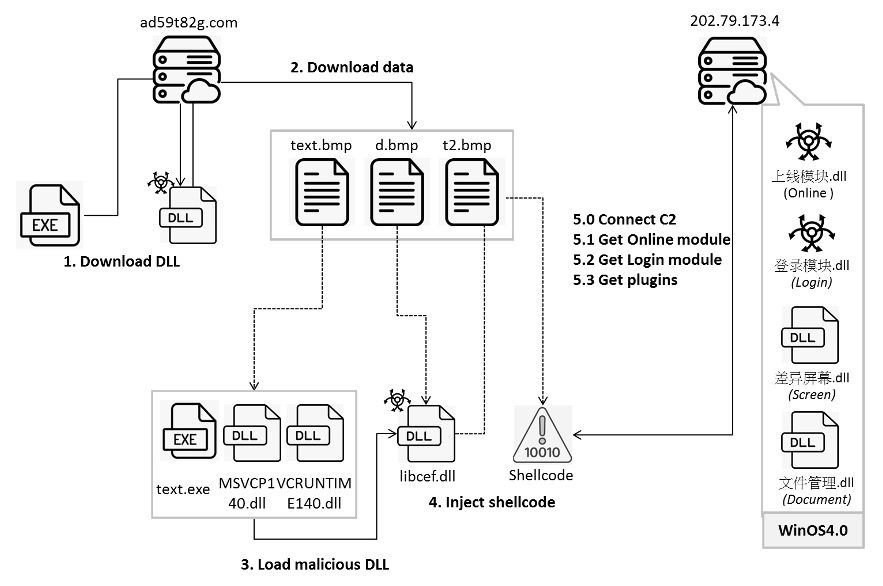 ขั้นตอนต่อไป ไฟล์ "libcef.dll” จะทำการคลายตัวเอง และรันสคริปท์ในรูปแบบ Shell Code จากไฟล์ t5d.tmp เพื่อทำการติดต่อการเซิร์ฟเวอร์ควบคุม (C2 หรือ Command and Control) ที่มีหมายเลข IP คือ ("202.79.173[.]4") ผ่านโปรโตคอลแบบ TCP เพื่อดาวน์โหลดไฟล์ DLL อีกตัวหนึ่งลงมาที่มีชื่อว่า 上线模块.dll ลงมาบนเครื่อง