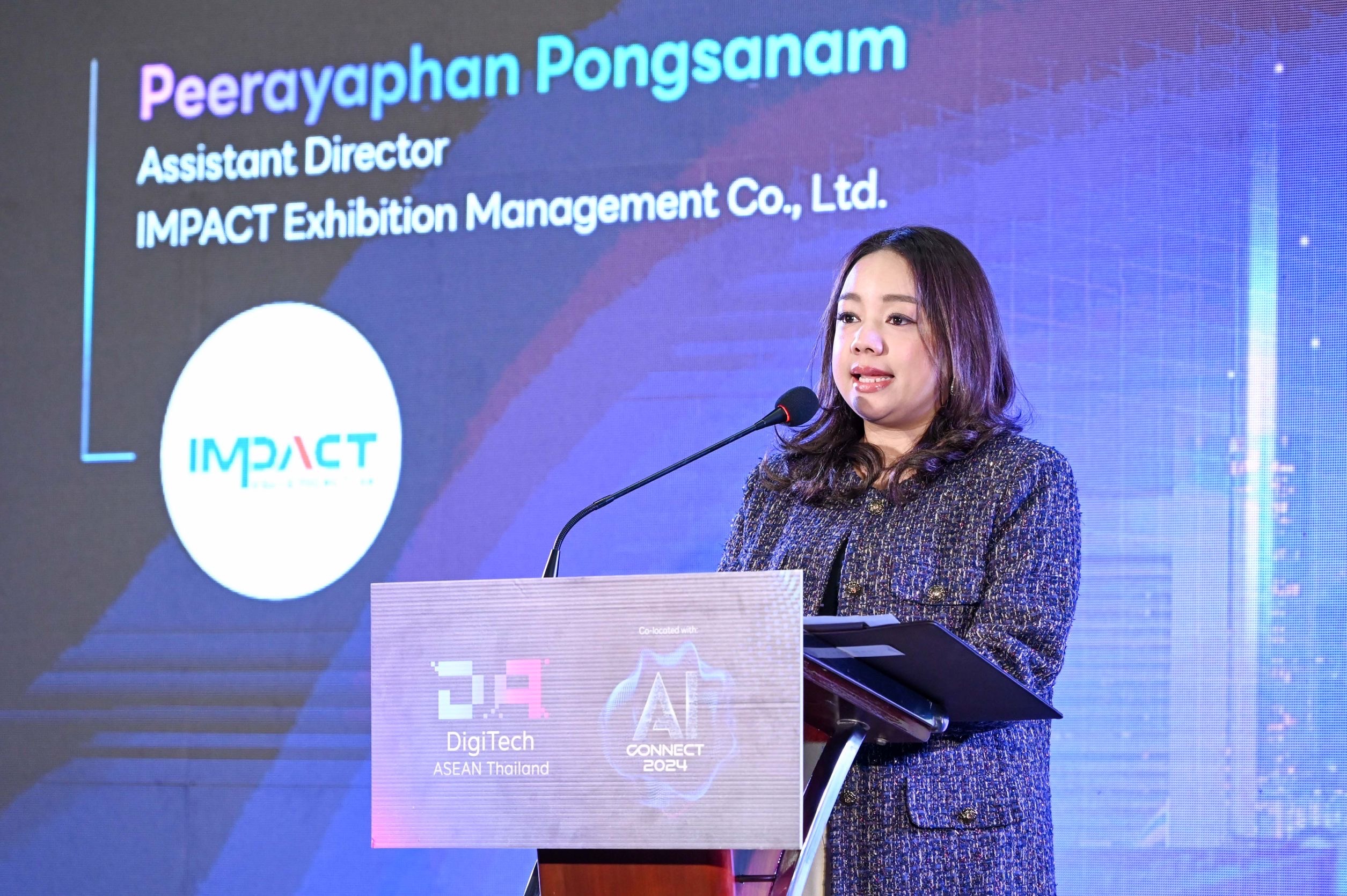 คุณพีรยาพัณณ์ พงษ์สนาม ผู้ช่วยผู้อำนวยการ บริษัท อิมแพ็ค เอ็กซิบิชั่น แมเนจเม้นท์ จำกัด กล่าวว่า งาน "DigiTech ASEAN Thailand & AI Connect 2024" ถือเป็นเวทีแสดงถึงศักยภาพของประเทศไทยในด้านนวัตกรรมดิจิทัล และ AI ซึ่งไม่เพียงจะส่งเสริมอุตสาหกรรมที่มีมูลค่าสูงของประเทศไทย แต่ยังสร้างโอกาสทางธุรกิจใหม่ๆ เสริมสร้างความร่วมมือระหว่างประเทศ และสนับสนุนเป้าหมายของประเทศไทยในการก้าวสู่เศรษฐกิจที่ยั่งยืน และขับเคลื่อนด้วยนวัตกรรม คาดว่างานนี้จะมีผู้เข้าร่วมงานทั้งจากในประเทศ และต่างประเทศกว่า 6,000 คน