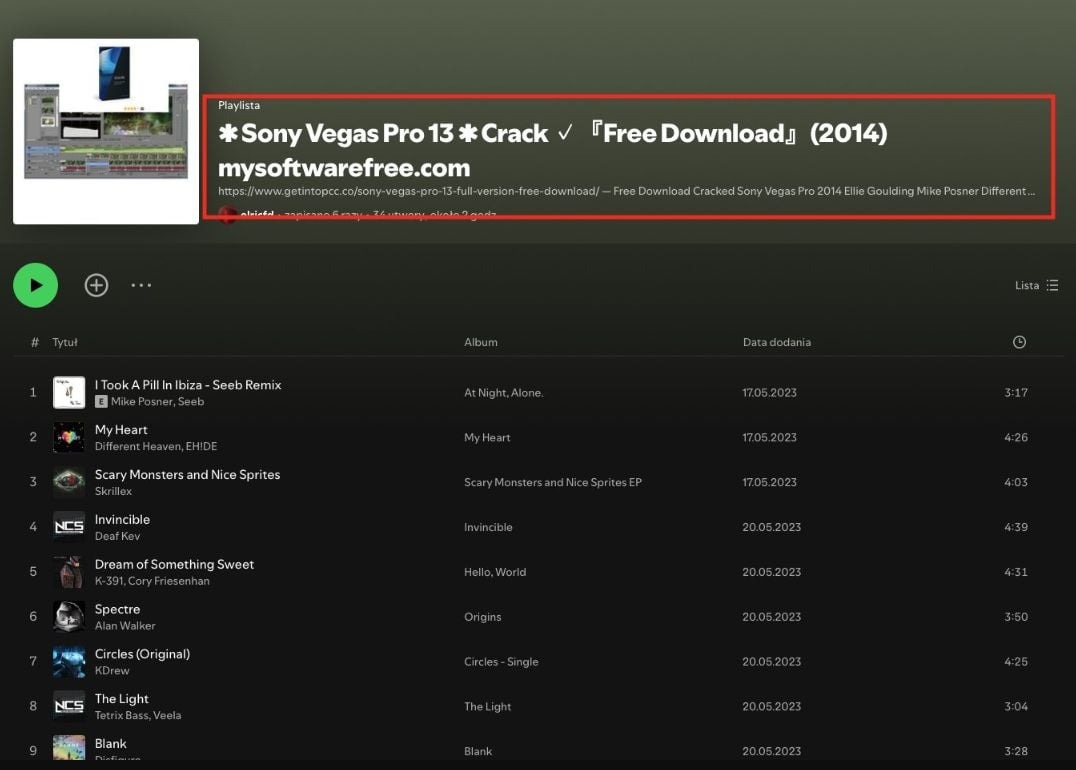จากรายงานโดยเว็บไซต์ Bleeping Computer ได้รายงานถึงการตรวจพบพฤติกรรมการโปรโมตซอฟต์แวร์เถื่อน, โปรแกรมโกงเกม, รวมไปถึงลิงก์สแปม และ เว็บไซต์สำหรับการดาวน์โหลดซอฟต์แวร์เถื่อน (Warez Sites) ด้วยวิธีการที่เหนือความคาดหมาย นั่นคือ การใช้รายการลำดับการฟัง หรือ Playlist ที่อยู่บนแอปพลิเคชันสำหรับการสตรีมมิ่งเพลง และพอดแคสต์ชื่อดังอย่าง Spotify ซึ่งเป็นการใช้เทคนิคด้วยการใช้คำที่คนมักจะค้นหาบ่อย ๆ เพื่อทำให้เวลาค้นหาคำ Playlist ดังกล่าวก็จะปรากฎขึ้นมาลำดับต้น ๆ ในทันที