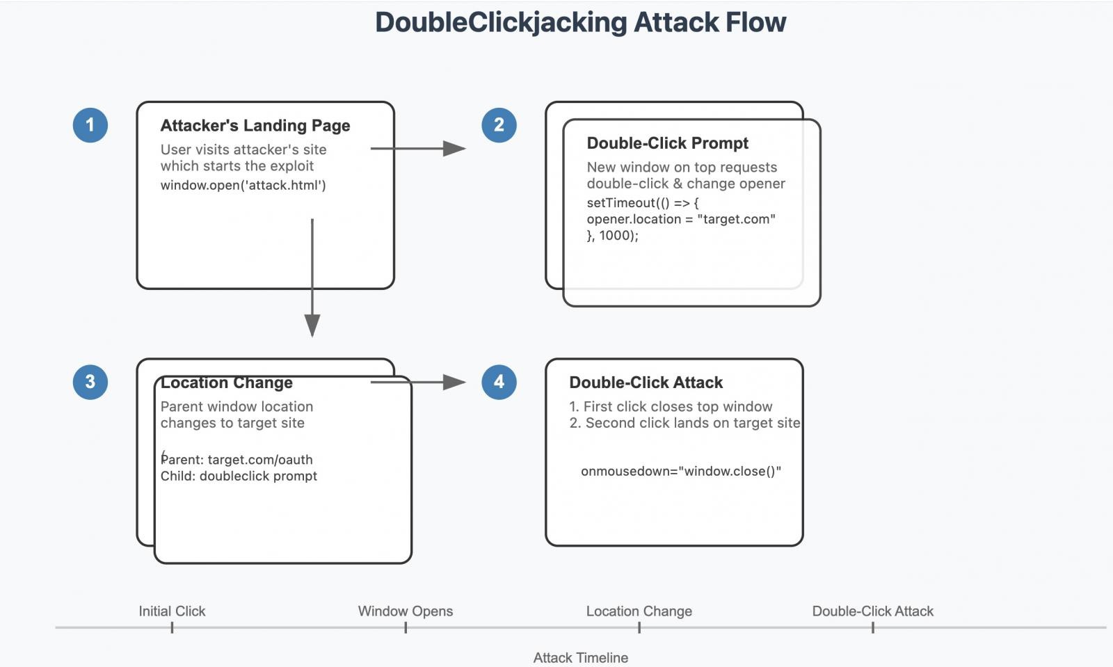 จากรายงานโดยเว็บไซต์ Bleeping Computer ได้รายงานถึงการตรวจพบเทคนิคการขโมยบัญชีผู้ใช้งานในรูปแบบใหม่ ซึ่งเป็นเทคนิคที่ถูกเรียกว่า "DoubleClickjacking" ซึ่งจะเป็นการหลอกล่อให้เหยื่อทำการคลิก 2 ครั้ง หรือ Double Clicks ในจุดที่กำหนด อันจะนำไปสู่การให้สิทธิ์ (Permission) บางอย่างกับแฮกเกอร์ เช่น การอนุญาตให้แอปพลิเคชันยืนยันตัวตนเชื่อมต่อกับบัญชีของแฮกเกอร์ อันจะนำไปสู่การขโมยบัญชีการใช้งานบริการของเหยื่อได้