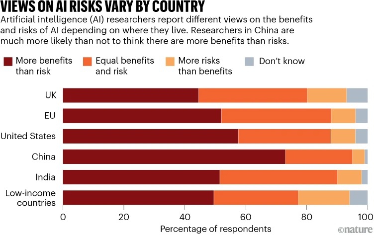 ในแง่มุมนี้ นักวิจัยจากชาติต่าง ๆ นั้นล้วนแต่มีความคิดเห็นที่แตกต่างกันออกไป แต่ในภาพ อย่างเช่น นักวิจัยจากประเทศจีนมากกว่า 70% นั้นมีความเห็นว่าการใช้งาน AI จะนำมาซึ่งประโยชน์ต่อผู้ใช้งาน โดยมีเพียงแค่ 10 % กว่า ๆ เท่านั้นที่มองว่าการใช้งาน AI จะมีความเสี่ยงเชิงลบมากกว่าประโยชน์ที่ได้รับ ขณะที่นักวิจัยจากสหราชอาณาจักร (UK หรือ United Kingdom) กลับมีความเห็นกึ่ง ๆ ที่ส่วนหนึ่งมองว่าการใช้งานนั้นจะได้ประโยชน์มากกว่าโทษ ราว ๆ 40% และอีกประมาณ 30% กลับมองว่า การใช้งาน AI ทั้งประโยชน์และโทษมีอยู่เท่ากัน