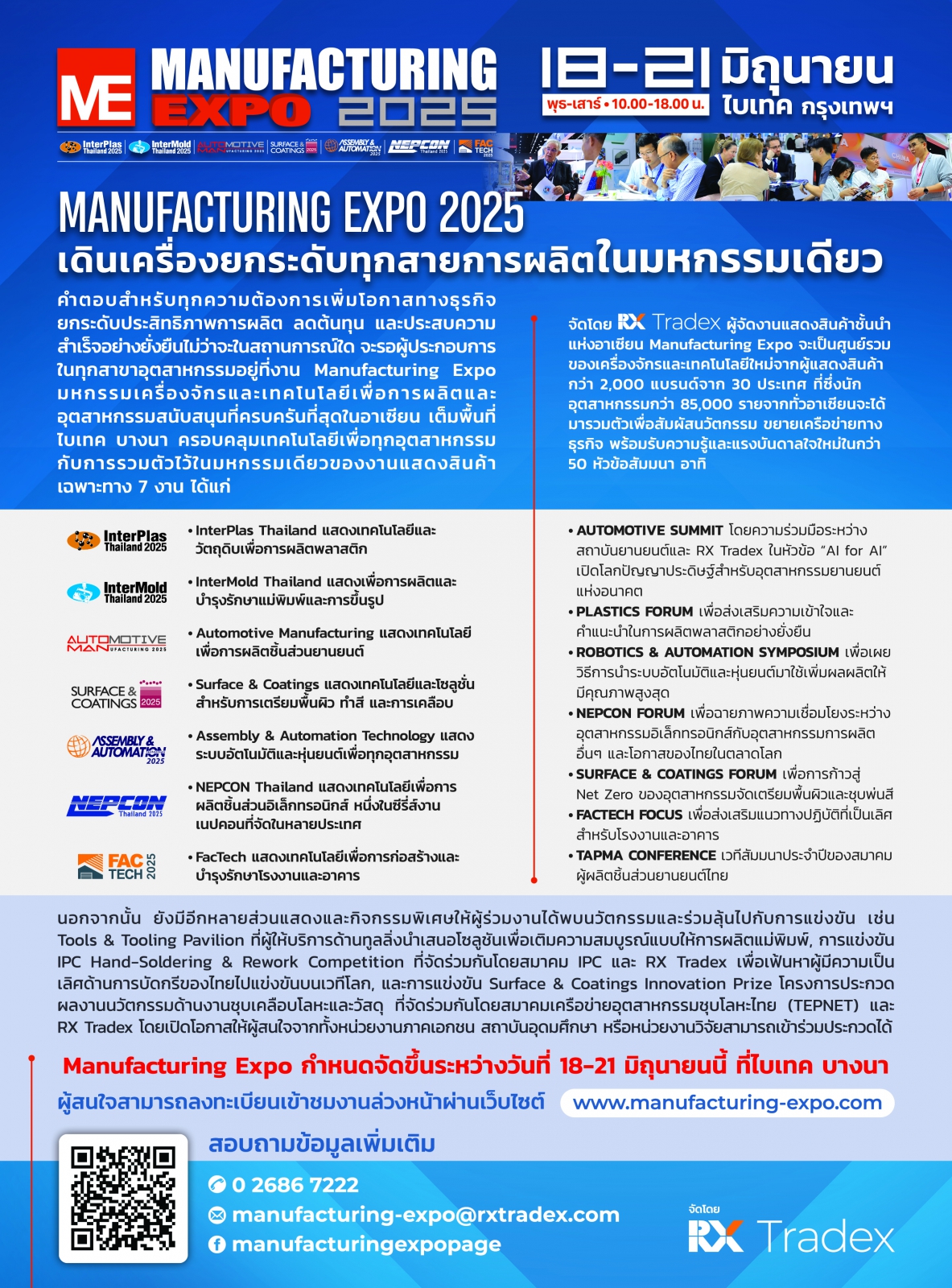 Manufacturing Expo กำหนดจัดขึ้นระหว่างวันที่ 18-21 มิถุนายนนี้ ที่ไบเทค บางนา ผู้สนใจสามารถลงทะเบียนเข้าชมงานล่วงหน้าผ่านเว็บไซต์ www.manufacturing-expo.com หรือสอบถามข้อมูลเพิ่มเติมได้ที่อีเมล manufacturing-expo@rxtradex.com โทร 0 2686 7222 และช่องทางโซเชียลมีเดีย ที่ FB: manufacturingexpopage, Line OA: @me_expo