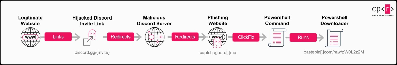 โดยตัวลิงก์นั้นเมื่อลิงก์ถูกกดโดยเหยื่อ ก็จะเป็นการนำพาเหยื่อไปยังหน้าเพจที่ถูกฝังสคริปท์แบบ ClickFix (สคริปท์ที่จะขึ้นหน้าจอหลอกให้เหยื่อทำตามคำสั่งโดยอ้างว่าเป็นการทำเพื่อจัดการกับข้อผิดพลาดที่เกิดขึ้น แท้จริงแล้วเป็นการหลอกให้เหยื่อทำการรันสคริปท์ดาวน์โหลดและติดตั้งมัลแวร์) ซึ่งสำหรับแคมเปญนี้จะเป็นการหลอกลวงเหยื่อว่ากำลังเข้าสู่ขั้นตอนของการยืนยันตัวตน (Verification) โดยบอทรักษาความปลอดภัยที่มีชื่อว่า “Safeguard” หลังจากที่เหยื่อคลิ๊กปุ่มยืนยันตัวตนแล้ว ตัวเพจจะนำพาเหยื่อไปยังเพจที่อยู่นอกเซิร์ฟเวอร์ของ Discord ซึ่งเป็นเว็บไซต์สำหรับการทำ Phishing โดยเฉพาะที่มี URL ว่า captchaguard[.]me โดยหน้าจอของเพจจะมีการแสดง Google Captcha (ปลอม) ขึ้นมา แต่จะเป็นการแสดงแบบหลอกว่าโหลดตัว Capthca ไม่สำเร็จ ขอให้เหยื่อทำการยืนยันตัวตนแบบ Manual ซึ่งในจังหวะนี้ตัว JavaScript ที่ซ่อนอยู่ก็จะทำการคัดลอกคำสั่ง PowerShell สำหรับการดาวน์โหลดและรันมัลแวร์ไว้ใน Clipboard โดยตัวสคริปท์ PowerShell นั้นจะมีลักษณะดังนี้