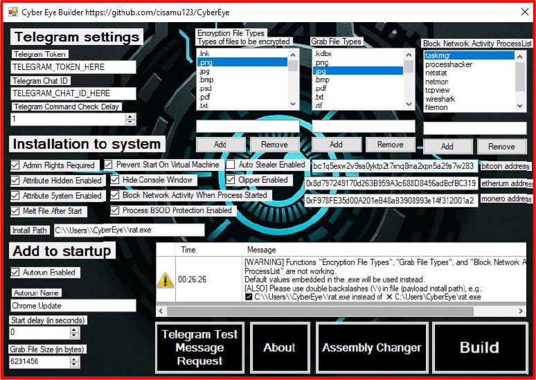 จากรายงานโดยเว็บไซต์ Cyber Security News ได้กล่าวถึงการตรวจพบแคมเปญการแพร่กระจายมัลแวร์ประเภทเข้าควบคุมระบบจากทางไกล (Remote Access Trojan หรือ RAT) ชื่อ CyberEYE ซึ่งเป็นมัลแวร์ที่มีประสิทธิภาพในการขโมยข้อมูลที่ค่อนข้างสูงจากการที่สามารถขโมยได้มาก และหลากประเภท ไม่ว่าจะเป็น รหัสต่าง ๆ ที่บันทึกไว้บนเว็บเบราว์เซอร์, Session สำหรับเข้าใช้งานแพลตฟอร์มสำหรับเล่นวิดีโอเกมต่าง ๆ (เช่น Steam), ข้อมูลของกระเป๋าเงินคริปโตเคอร์เรนซี ไปจนถึงรหัส Wifi ที่ถูกบันทึกไว้บนเครื่อง โดยข้อมูลเหล่านี้จะถูกส่งกลับไปยังบอทบน Telegram ผ่าน API โดยมัลแวร์มีวิธีในการขโมยข้อมูลที่หลากหลาย ทั้งการเข้าเก็บข้อมูลด้วยวิธีการทั่วไป, การเข้าเก็บข้อมูลและดัดแปลงข้อมูลบน Clipboard ไปจนถึงการตรวจจับการพิมพ์ของเหยื่อ (Keylogging) นอกจากนั้นมัลแวร์ตัวนี้ยังมีความสามารถในการปิดการทำงานของ Windows Defender อีกด้วย