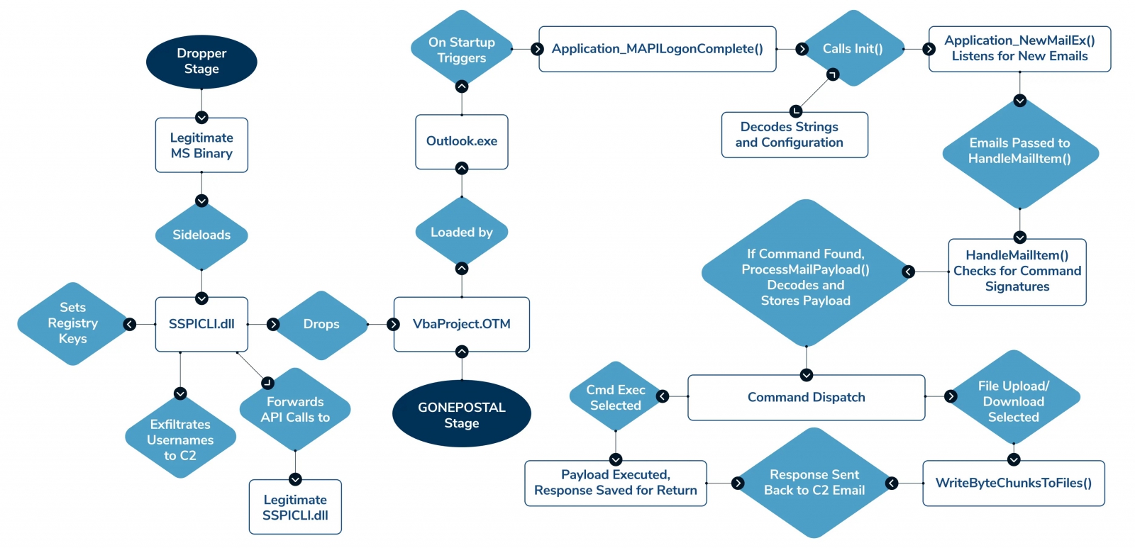 มัลแวร์ดังกล่าวนี้ อย่างที่กล่าวไว้ข้างต้นนั้นคือ ตัวมัลแวร์จะมากับเอกสารด้านธุรกิจ (ปลอม) ที่ส่งให้เหยื่อ โดยมัลแวร์นั้นจะแฝงตัวในรูปแบบโค้ด VBA Macro ที่อยู่บนเอกสาร ที่จะทำหน้าที่ในการปล่อยมัลแวร์นกต่อ (Launcher) ลงไปยังโฟลเดอร์ชั่วคราวบนระบบของเหยื่อ หลังจากนั้นตัว Launcher จะทำการดาวน์โหลดโมดูล (Module) ต่าง ๆ ของมัลแวร์ GONEPOSTAL สร้างเซิร์ฟเวอร์ของแฮกเกอร์ ทั้งยังหลีกเลี่ยงการถูกตรวจจับด้วยการเนียนตัวเองไปกับการทำงานเป็นกิจวัตร (Routine) ของตัวซอฟต์แวร์ MS Outlook โดยทางทีมวิจัยได้เปิดเผยว่าโค้ด VBA Macro ดังกล่าวนั้นมีการแทรกโค้ดเพื่อสร้างความสับสนให้กับระบบตรวจจับ (Obfuscation) อย่างหนักหน่วง โดยเริ่มต้นจากการ Declare ส่วนของ Outlook COM Object ในรูปแบบดังนี้