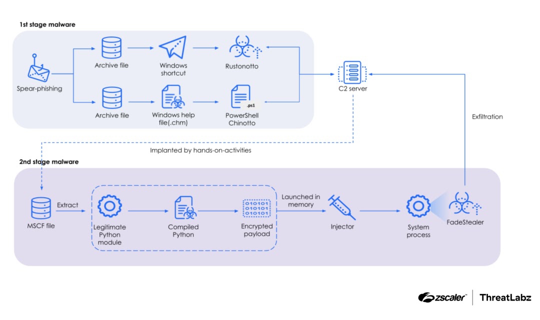 สำหรับมัลแวร์ FadeStealer ที่ถูกปล่อยลงมาในขั้นสุดท้ายนั้น จะทำหน้าที่เป็นตัวสอดส่องเหยื่อตัวจริง จากความสามารถในการดักจับการพิมพ์ (Keylogger), การแอบบันทึกหน้าจอทุก 30 วินาที, ความสามารถในการแอบบันทึกเสียงของเหยื่อได้ถึง 5 นาที, อีกทั้งยังมีการแอบสอดส่องการใช้งานไดร์ฟ USB อย่างเงียบเชียบอีกด้วย ซึ่งข้อมูลที่ถูกขโมยได้ทั้งหมดจะถูกรวบรวมเป็นไฟล์บีบอัดนามสกุล RAR ที่มีการใช้งานรหัสผ่านเพื่อป้องกันการถูกเข้าถึง โดยรหัสผ่านที่ใช้งานนั้นจะถูกตั้งเป็นค่าคงที่บันทึกไว้ในโค้ดของมัลแวร์ (Hardcoded) และไฟล์บีบอัดนี้จะถูกส่งกลับในรูปแบบไฟล์ที่ถูกตัดแบ่งเป็นหลายส่วนไปยังเซิร์ฟเวอร์ C2 ด้วยช่องทาง HTTP POST Requests