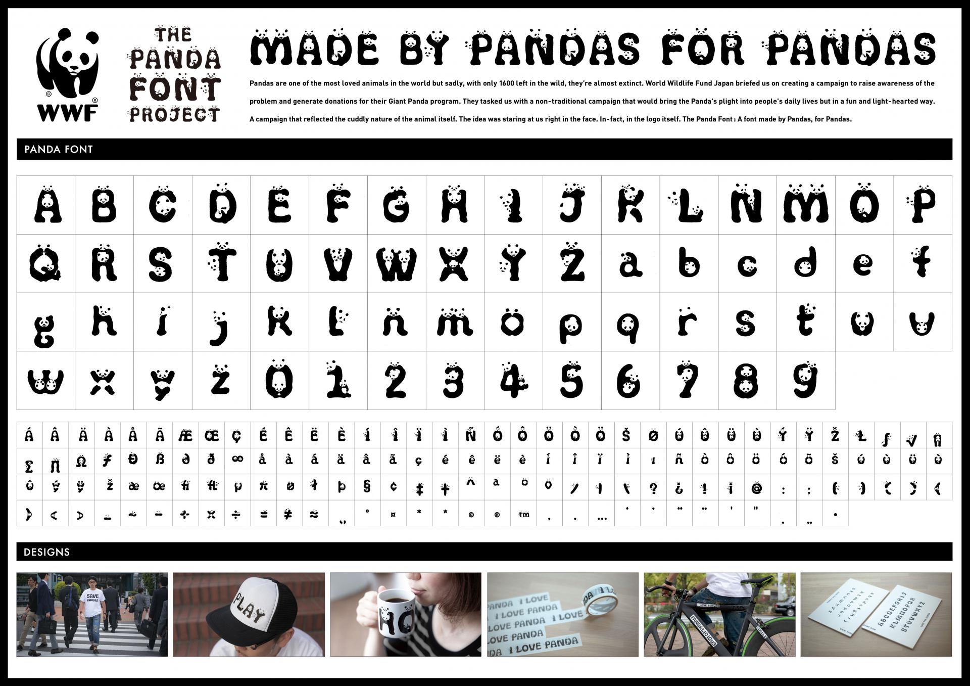 WWF (World Wildlife Fund) องค์การกองทุนสัตว์ป่าโลกสากล เป็นองค์กรที่ไม่หวังผลกำไร มีเป้าหมายในการอนุรักษ์สิ่งแวดล้อมระหว่างประเทศ โดย WWF Japan ได้ออกแบบฟอนต์แพนด้าขึ้นมาเพื่อประชาสัมพันธ์โครงการอนุรักษ์หมีแพนด้าที่มีจำนวนเหลือน้อยลงมาก โดยจากรายงานของ WWF พบว่ามีหมีแพนด้าตามธรรมชาติเหลืออยู่ในป่าเพียง 1,864 ตัว เท่านั้น ทาง WWF คาดหวังว่าฟอนต์แพนด้านี้จะช่วยให้คนหันมาสนใจหมีแพนด้ามากขึ้น