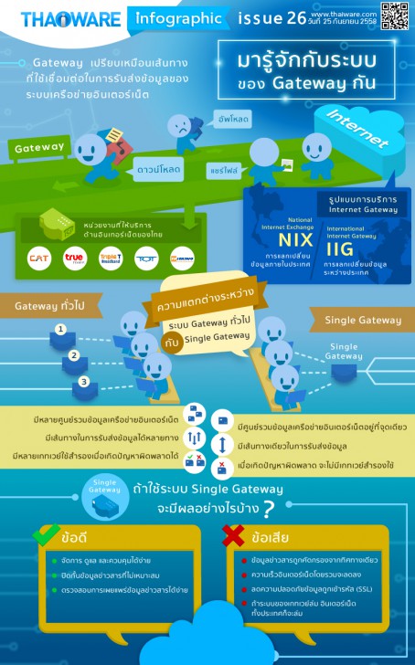 Smittyหลายคนอาจยังสงสัยว่า Gateway คืออะไร ใช้ทำอะไร และมีความสำคัญกับระบบการใช้งานอินเตอร์เน็ตอย่างไรบ้าง ซึ่งความจริงแล้วระบบการทำงานของ Gateway นี้ ถือเป็นเรื่องที่ใกล้ตัวของเรามาก เพราะในทุกครั้งที่เราใช้การเชื่อมต่ออินเตอร์เน็ตที่มีการรับ-ส่งข้อมูลต่างๆ จะถูกรวบรวมและส่งผ่านเข้าไปรวมอยู่ในสิ่งที่เรียกว่าเกทเวย์นี้ จึงเป็นเรื่องที่สำคัญและเป็นประโยชน์ในการที่จะรู้ถึงระบบการทำงานของเกทเวย์ ทางไทยแวร์จึงได้ทำ Thaiware Infographic ฉบับที่ 26 มารู้จักกับระบบของ Gateway นี้มาให้ได้ชมกัน