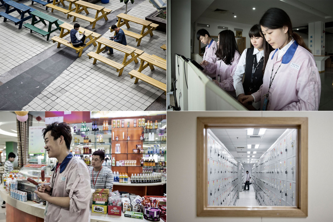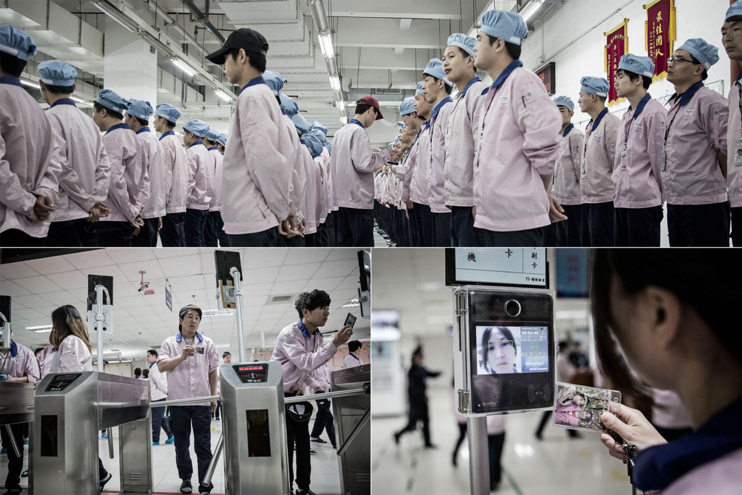 หลังจากเดินผ่านเครื่องสแกนโลหะ เพื่อตรวจจับกล้องที่พนักงานอาจเอาไปแอบถ่ายภาพหลุดของ iPhone รุ่นใหม่ไปแล้ว พนักงานต้องเดินตามลูกศรบนพื้นไปตามเส้นทางที่มีโปสเตอร์สร้างเสริมแรงบันดาลใจแปะอยู่บนกำแพง จากนั้นพนักงานต้องเดินขึ้นบันไดที่มีตาข่ายคลุมด้านข้างเพื่อป้องกันคนเดินพลัดตกไปโดยไม่ได้ตั้งใจ และส่วนหนึ่งก็น่าจะเพื่อป้องกันไม่ให้มีการกระโดดบันไดฆ่าตัวตายด้วย เมื่อมาห้องล็อกเกอร์ เป็นที่ทีพนักงานจะได้สวมตาข่ายสีน้ำเงินคลุมผม และเปลี่ยนรองเท้าพลาสติกที่ผ่านการทำความสะอาดมาอย่างดี และเมื่อถึงเวลา 9 โมง 20 นาที พนักงานจำนวน 320 คน เข้าประจำตำแหน่งในไลน์ผลิตของพวกเขา